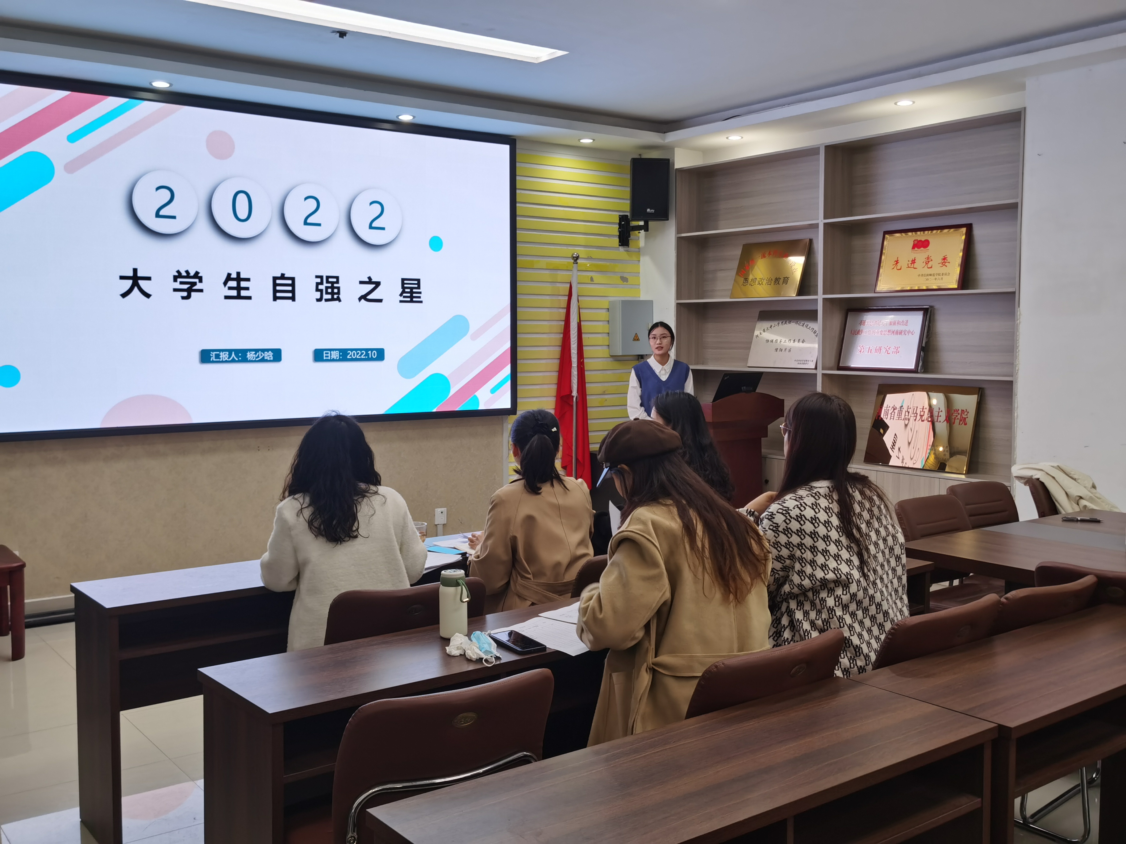 为深入贯彻落实习近平总书记关于青年工作的重要思想,鼓励青年践行“强国有我”的青春宣言,10月26日上午,sjb世俱杯网站在社科楼323会议室举办了“大学生自强之星”候选人评选活动,世俱杯官网团委书记陶青青,专职组织员任婷,班主任王明园、杨春艳、吴梦云出席活动并担任评委。活动由组织部负责人韩奕晨主持。