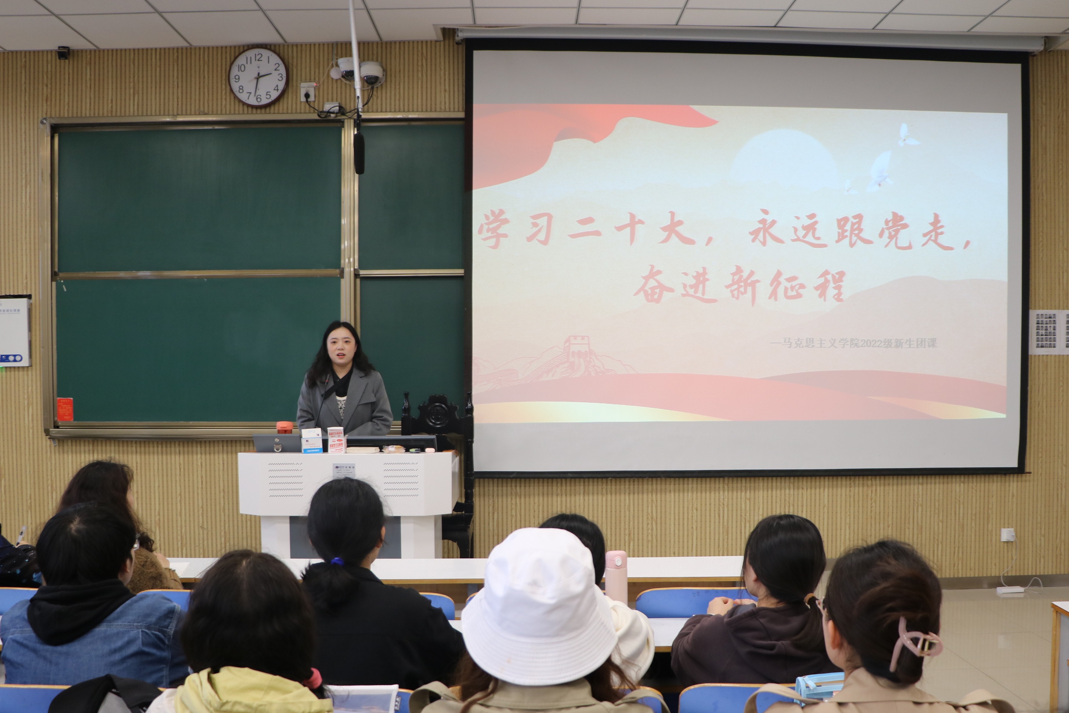 为进一步学习贯彻党的二十大精神,提高思政学子思想理论水平和政治素养,11月3日下午,sjb世俱杯网站在社科楼515教室开展以“学习二十大,永远跟党走,奋进新征程”为主题的第二次新生团校活动,2022级sjb世俱杯网站全体新生共同参加团课。本次团课由新生班主任王明园讲授。
