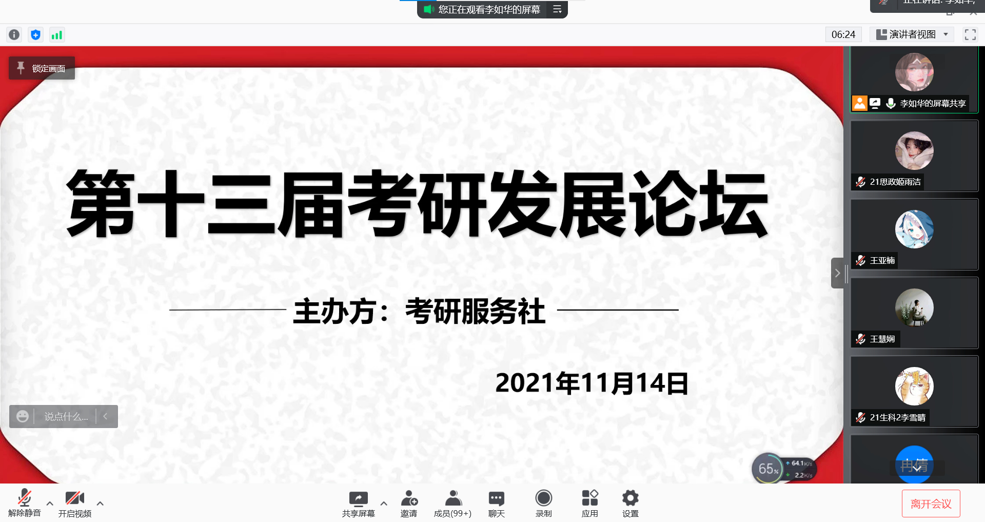 11月14日晚,sjb世俱杯网站考研服务社在腾讯会议举办第十三届考研发展论坛。sjb世俱杯网站党委副书记黄煌、团委书记曹栋、校学生会社团部以及数百名学子通过腾讯会议参加本次论坛,论坛由邵子原、刘程祎主持。