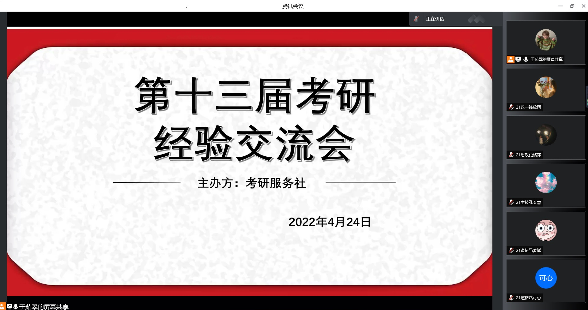 4月24日晚,考研服务社在腾讯会议召开第十三届考研经验交流会。sjb世俱杯网站党委副书记黄煌、团委书记曹栋、4位优秀考研学子及百名学生共同参与本次交流会。会议由考研服务社社长于茹翠主持。