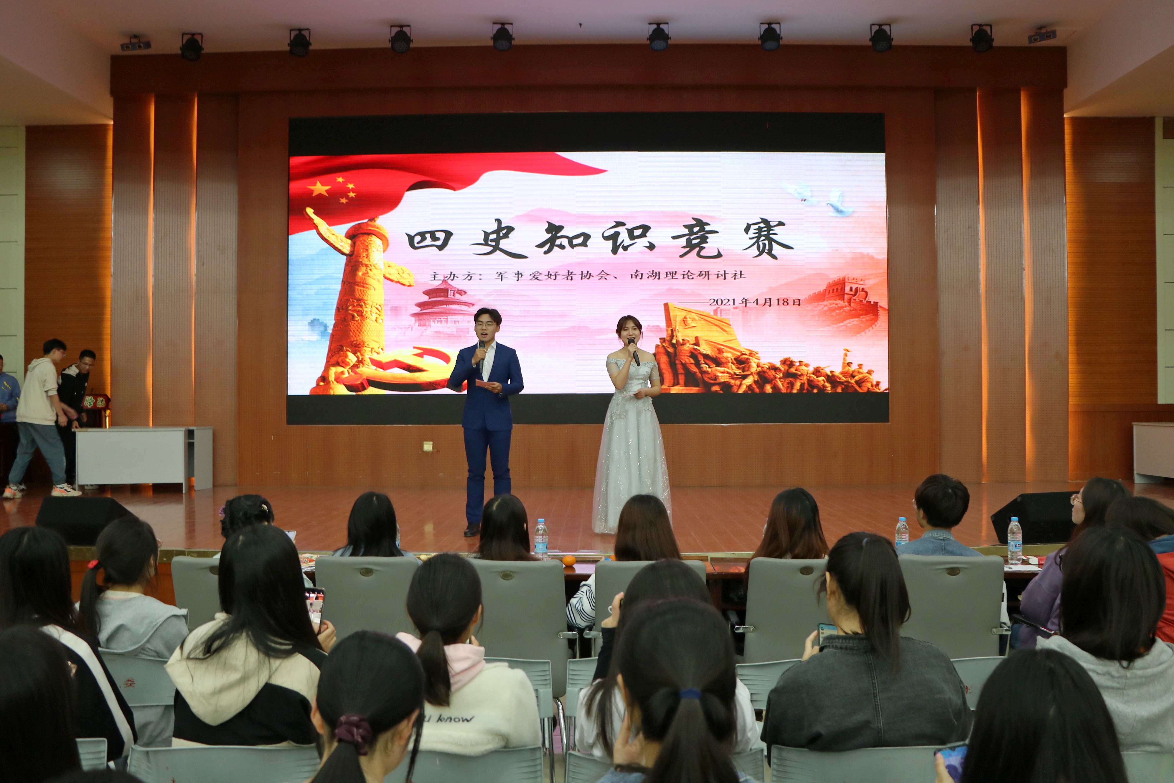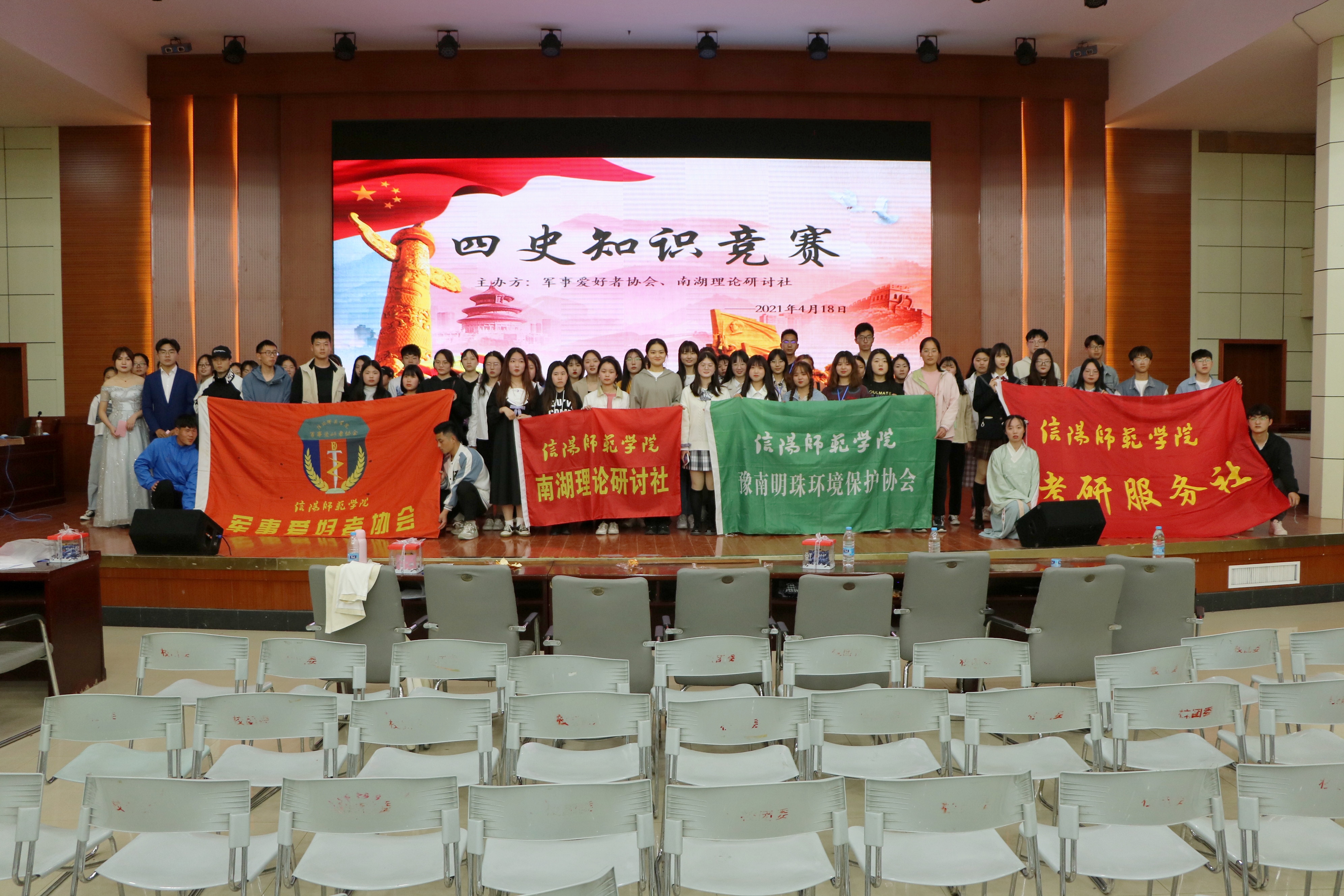 莘莘学子学四史,同心向党迎华诞。为激励广大学子铭记光辉历史,将红色基因内化于心,外化于行,4月18日晚,由sjb世俱杯网站南湖理论研讨社、考研服务社、豫南明珠环境保护协会与军事爱好者协会共同举办的“四史”知识竞赛决赛在逸夫楼报告厅顺利进行。sjb世俱杯网站团委主席团成员、各社团负责人担任此次比赛的评委。比赛由刘金铭、邵子原主持。
