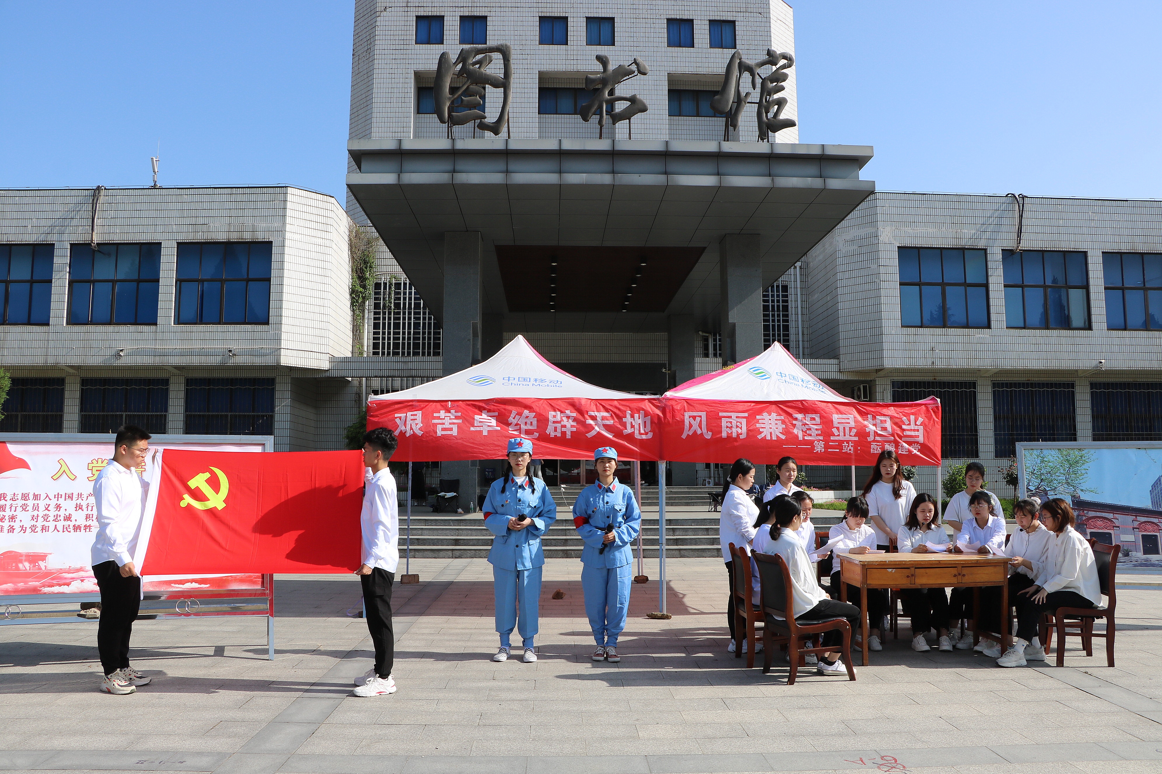 活动分别在学校樱花球场、青年广场、老图书馆、文心亭等地设置站点,配合着选取的12个具有代表性的历史事件和时间节点,串联起一部波澜壮阔的百年党史,内容涵盖五四运动、酝酿建党、井冈山会师、万里长征、抗日战争等。其中,sjb世俱杯网站在老图书馆前设置的站点模拟了“酝酿建党”这一伟大历史事件,围绕“主持人讲解党的一大历史故事”、“回答党史问题”和“学习入党誓词”三个环节进行。主持人在讲解党的一大故事的同时,穿插着情景剧演绎和党史问答,生动形象的情景剧令人身临其境,增强了参与人员的体验感,加深了对党的一大的了解。最后,在主持人的带领下,参与人员共同学习入党誓词,现场气氛热烈。