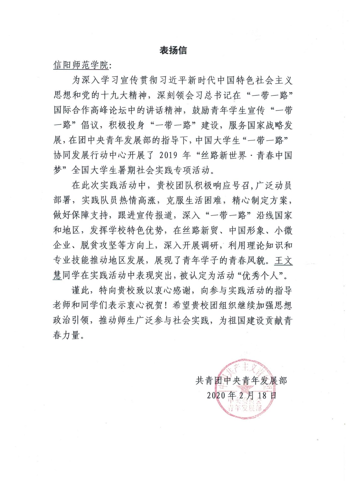 2020年9月21日,sjb世俱杯网站收到由共青团中央青年发展部发来的表扬信,信中提及世俱杯官网积极响应共青团中央的号召,参与由中国大学生“一带一路”协同发展行动中心开展的2019年“丝路新世界·青春中国梦”全国大学生暑期社会实践专项活动,团队队员热情高涨,充分展现sjb世俱杯网站学子的青春风貌。