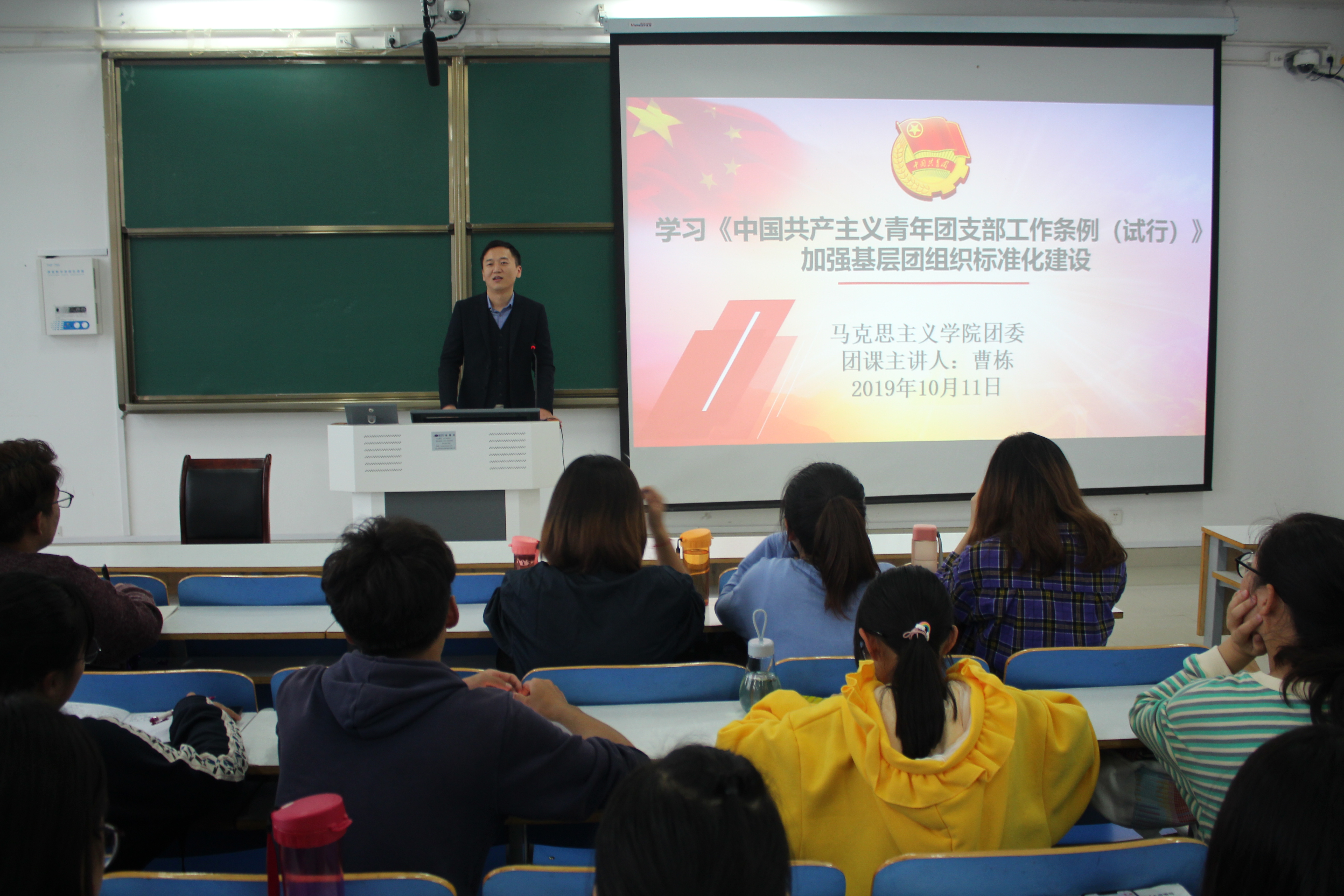 10月11日下午,sjb世俱杯网站团委书记曹栋在社科楼514教室以学习《中国共产主义青年团支部工作条例(试行)》为题,结合新时代团的基层建设问题为学子讲授一堂高水平团课。团委副书记肖妍杰、各年级团支部委员以及团小组组长共同聆听本次团课。