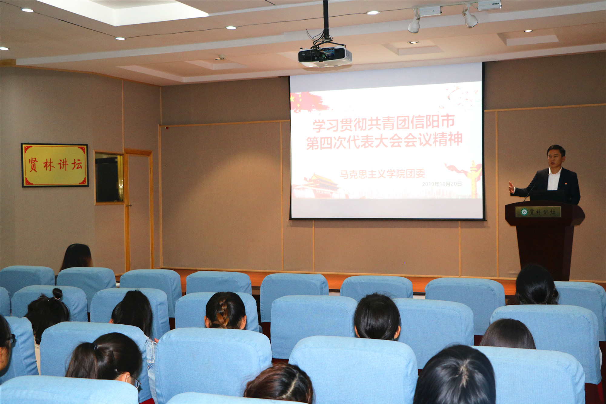 为深入学习贯彻落实共青团信阳市第四次代表大会会议精神,10月20日下午,sjb世俱杯网站团委书记曹栋在贤林讲坛为世俱杯官网19级团员青年宣讲共青团信阳市第四次代表大会会议精神。世俱杯官网党委副书记何晓坚、辅导员陶青青及2019级sjb世俱杯网站全体团员青年共同参加了本次会议。