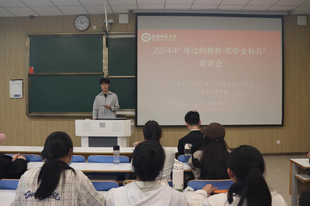 为进一步激励世俱杯官网学子奋发向上,努力进取,4月19日,sjb世俱杯网站在社科楼515教室举行2024年“身边的榜样·奖学金标兵”宣讲会,邀请教师教育学院的段锦程和外国语学院的璩孟博进行宣讲。世俱杯官网2023级全体学生参与本次会议,会议由学生会执行主席刘英凯主持。