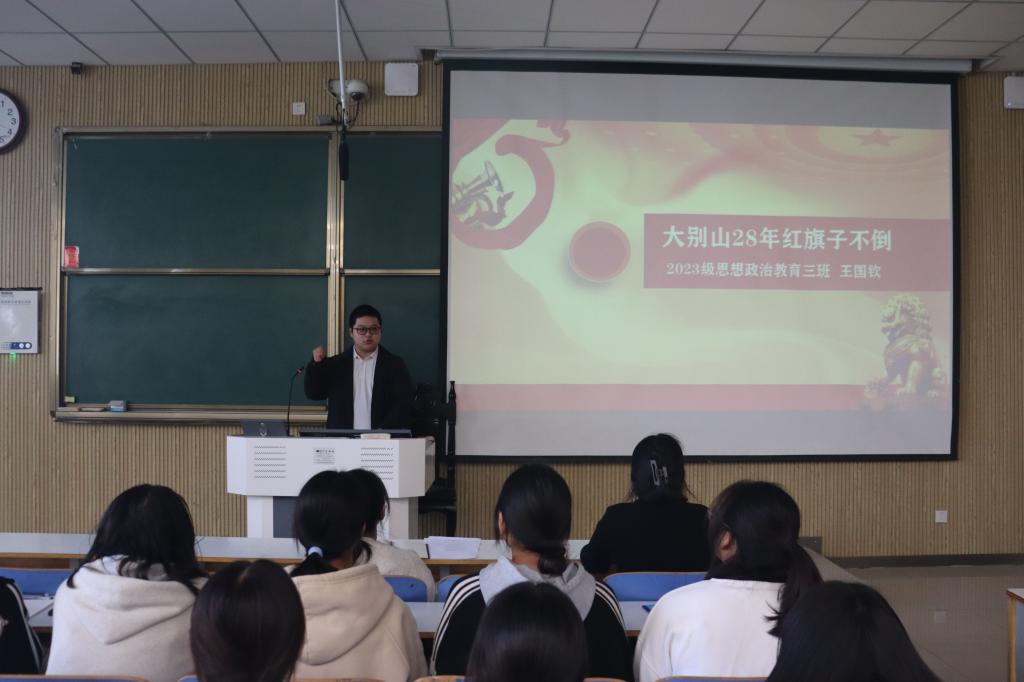 比赛开场,董思甜简要解读大别山精神的内涵与价值随后,王国钦和徐曼珍分别带来了题为《二十八年红旗子不倒》和《大将与大娘》的演讲,他们用充满激情和感染力的讲述,为即将登场的选手树立了标杆,拉开了比赛序幕。比赛中,5位选手紧扣主题各展风采,他们以小故事承载大精神,或聚焦英雄人物,或讲述感人故事,或着眼先进模范,让大别山精神具象化,重现党领导人民艰苦斗争的伟大历程。其中,段鹏博以《高举精神火炬,传递理想信念》为题,讲述“大别山的刘胡兰”肖国清在革命时期为掩护群众撤退宁死不屈的英勇事迹,展现大别山精神的红色传承。