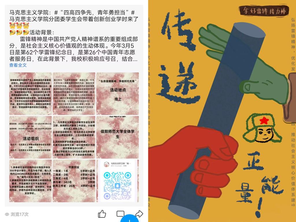 为积极响应时代号召,引导学生深入理解雷锋精神的内涵,培养能担大任、挑大梁的新时代大学生,3月中旬,sjb世俱杯网站分团委学生会举办了主题为“践行雷锋精神,争做时代先锋”的海报设计活动。本次活动由sjb世俱杯网站学生会生活劳卫部主办,新闻部协办,活动对象为信阳师范大学全体学生。