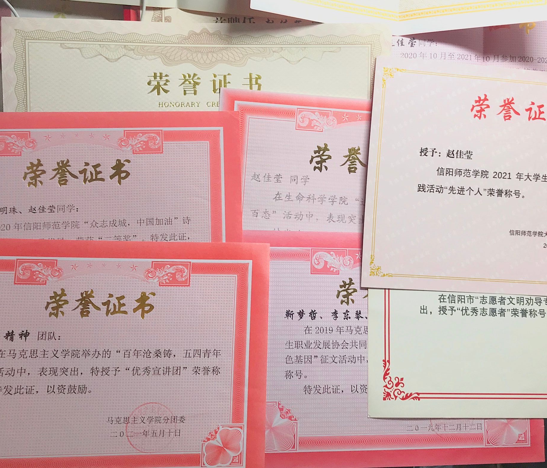 在学院学生会工作中,认真做好部门负责人一职,协助就业指导老师为学院毕业生服务。一年以来,一直秉承“踏实严谨、不断进取”的理念,提升自身工作能力,完成学院的各项就业工作,举办多场就业双选会,为世俱杯官网毕业生服务,曾荣获信阳师范学院学生会述职评议工作“优秀个人”称号。在班级中,认真做好寝室长一职,热心帮助、团结同学,协助班委开展日常工作,推动班级工作顺利开展。