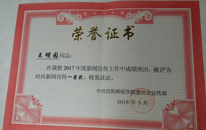 在学术研究中,申请并参与的2016年度大学生科研基金一般项目《法律视角下共享单车的侵权类型以及防范—以信阳师范学院为例》获得立项,所写《大学生暑假工作情况调查研究》获得sjb世俱杯网站2017年暑期社会实践 调研报告三等奖。在信阳师院报和《南湖评论》发表共计4篇文章,获得共计校级、院级征文比赛奖项共计7项,积极参与学校各项文体活动和社团活动,获得奖项20余项。