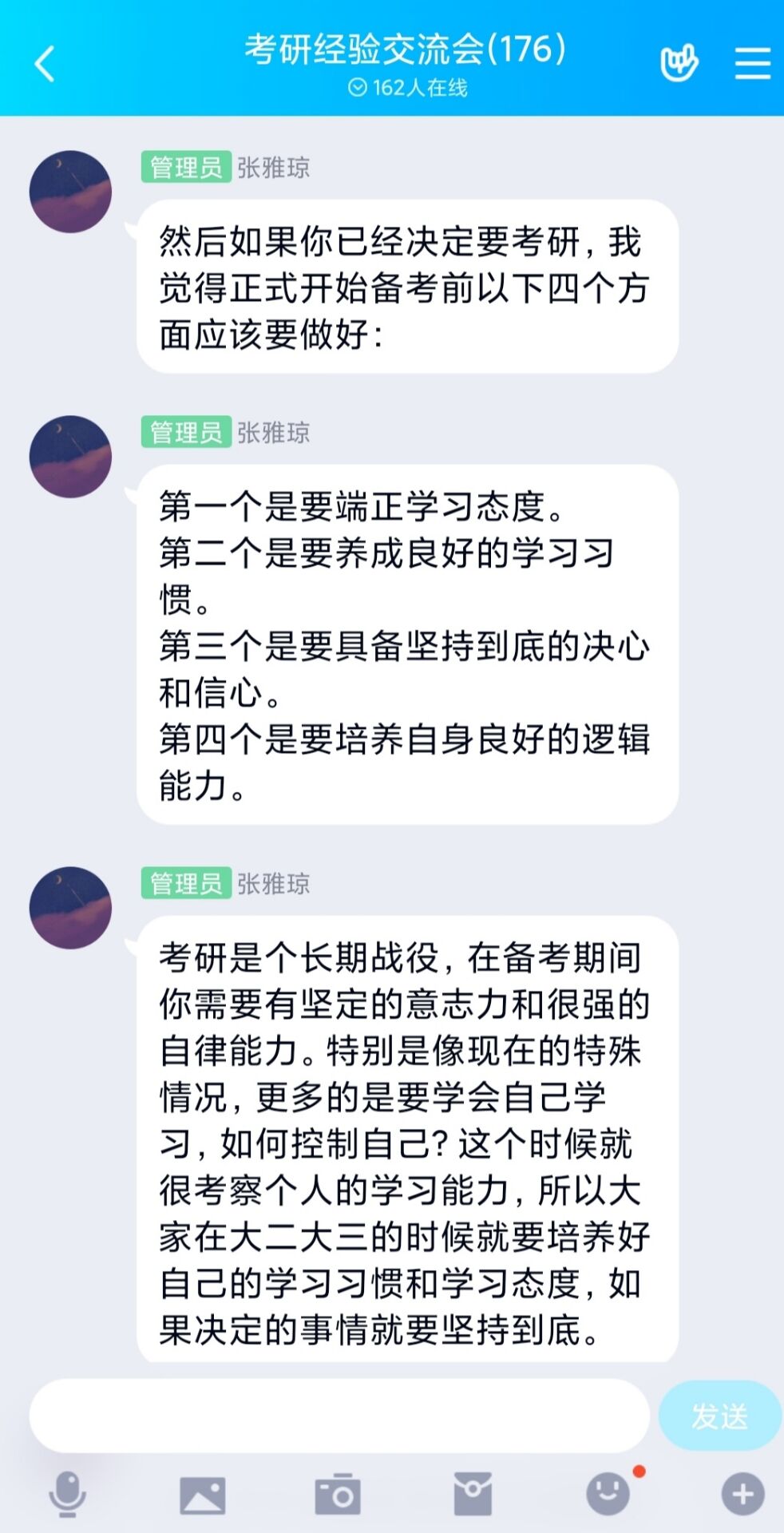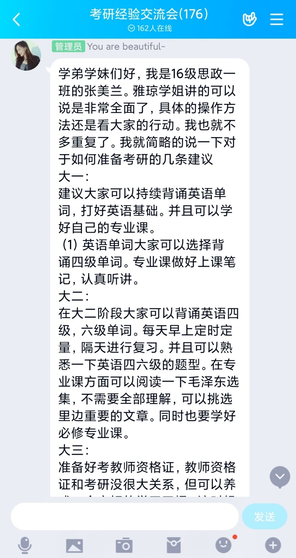 6月11日下午,sjb世俱杯网站考研服务社通过腾讯QQ线上平台举办了“以梦为笔,绘美研途”主题考研经验交流会。世俱杯官网2016级优秀考研学生代表张雅琼、张美兰以及2018、2019级有意向考研的同学共同参加本次交流会。会议由考研服务社牛笑怡主持。