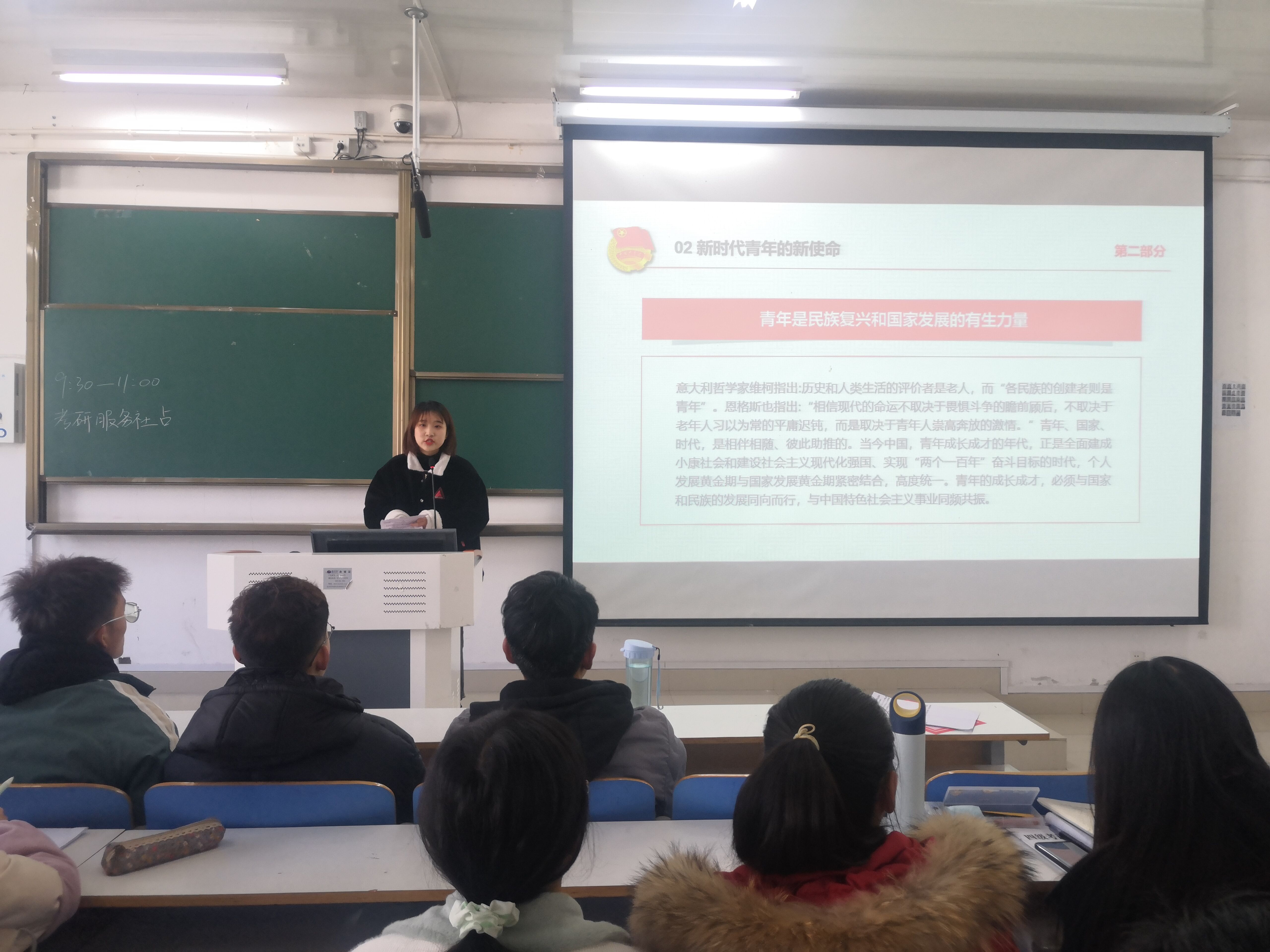 首先,团支书徐千涵从共青团的使命及性质、新时期青年的新使命、青年不忘初心跟党走、青年建功新时代四个部分对“深入学习贯彻新时代新使命”主题团课进行讲解。阐明共青团员是中国共产党领导的先进青年群众组织,表明青年的成长成才必须与国家民族的发展同向而行,与中国特色社会主义事业同频发展。激励广大团员牢记使命 ,当代青年要坚定马克思主义信仰。接着,由社长雷诗雨提问了两名同学发表他们对第二和第四部分的见解。最后,社长雷诗雨和团支书徐千涵对“新时期青年新使命”团课进行总结。
