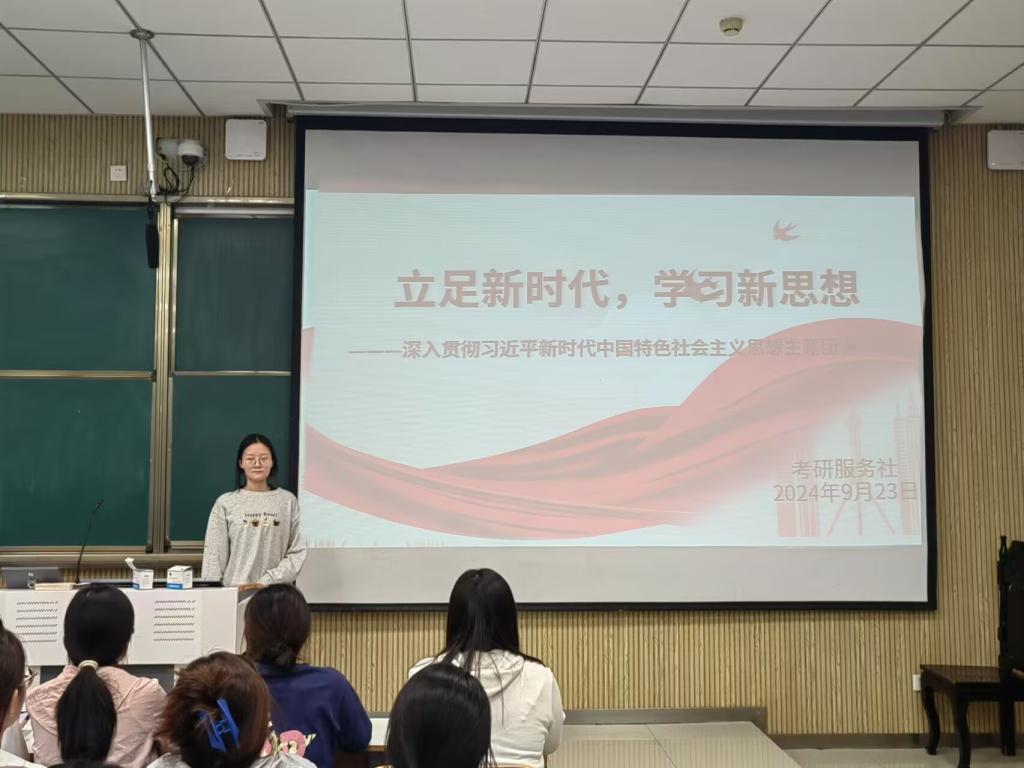 为深入学习贯彻习近平新时代中国特色社会主义思想,引导社团成员了解其思想内涵,勇担使命、砥砺前行。9月23日晚,考研服务社在社科楼515开展了“立足新时代,学习新思想”主题团课。社团全体成员参加本次团课活动,活动由团支书冀艺婷主持。