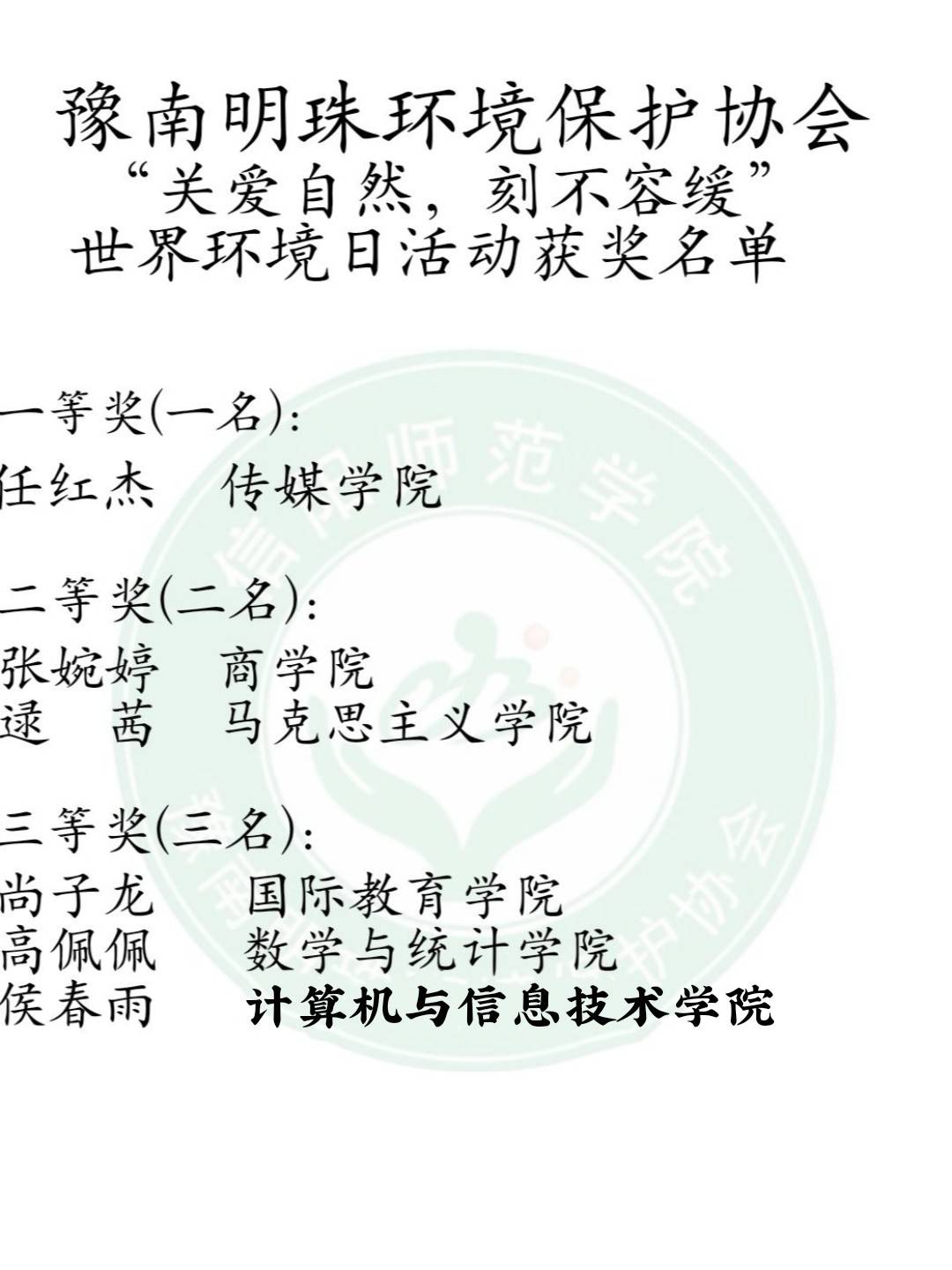 为增强学生的环保意识,培养学生的环保素养,6月8日—6月15日,由sjb世俱杯网站分团委主办,豫南明珠环境保护协会承办的以“关爱自然,刻不容缓”为主题的世界环境日活动于到梦空间线上平台顺利开展。