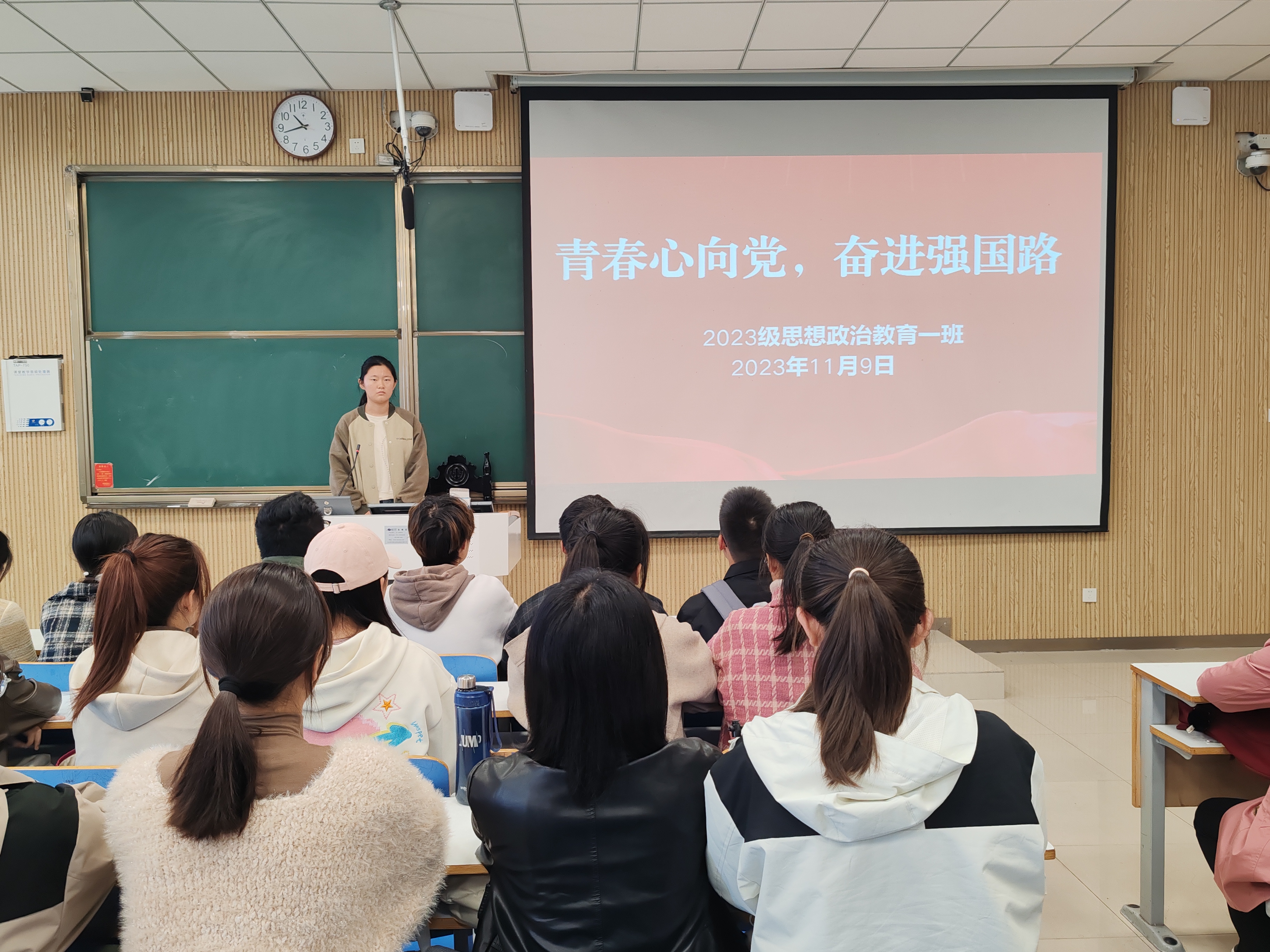 为进一步引导我班学子树立共产主义远大理想,坚定中国特色社会主义共同理想,坚定听党话、跟党走的政治信念,11月8日上午,sjb世俱杯网站2023级思想政治教育一班在社科楼515教室召开“青年心向党,奋进强国路”主题团课。世俱杯官网2023级思想政治教育一班全体同学共同参与本次团课,团课由团支书张卓主持。