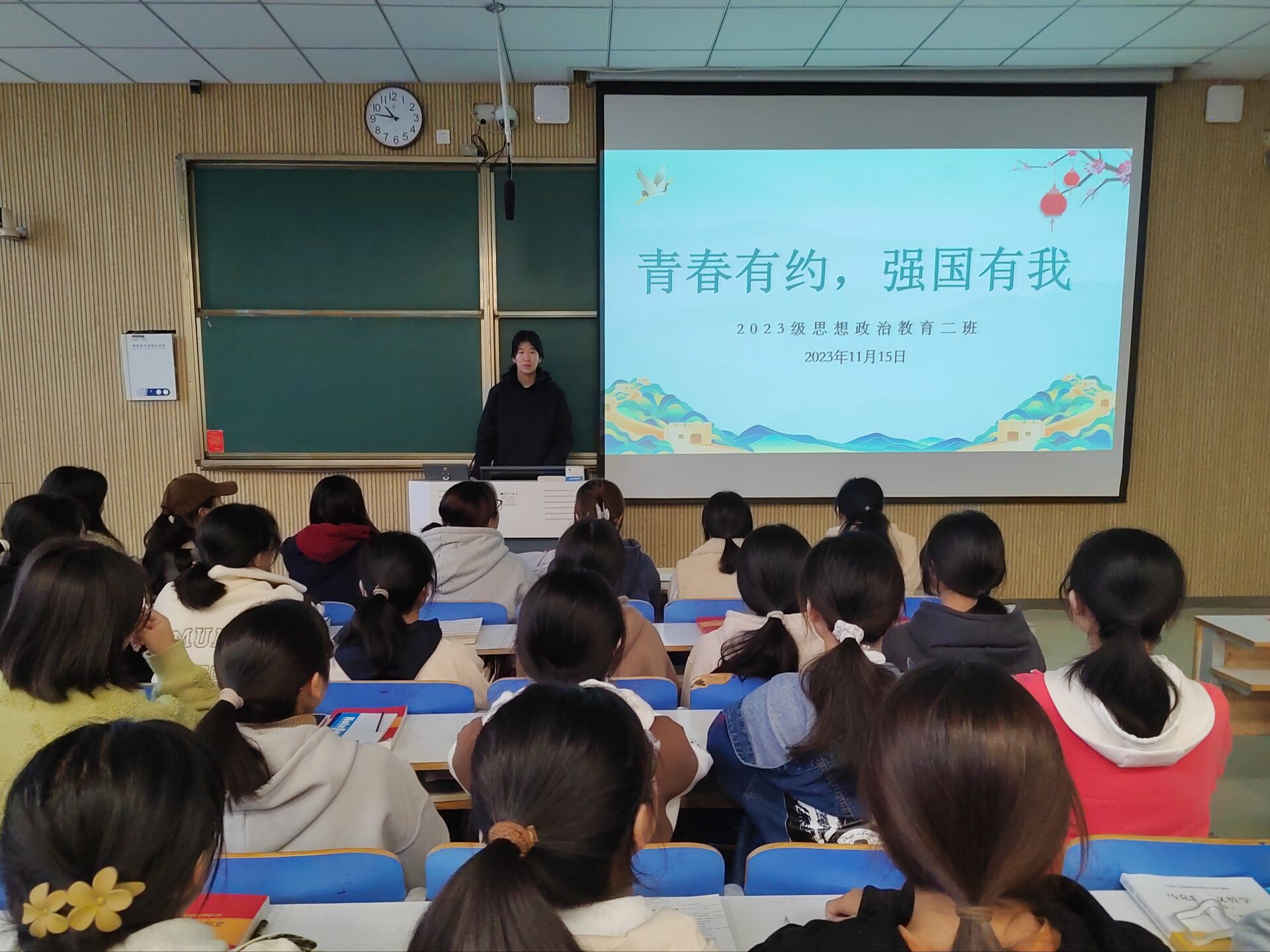 为引导学生坚定听党话、跟党走的崇高信念,用实际行动助力第二个百年奋斗目标,11月15日中午,sjb世俱杯网站思想政治教育二班在社科楼515教室召开“青春有约,强国有我”主题团课。本次团课由团支书王慜初主持。