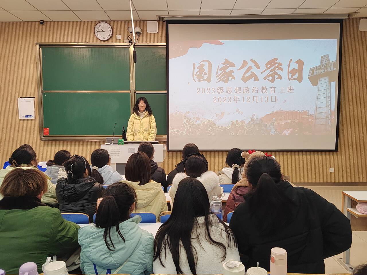 为使同学们铭记历史,激发爱国热情,传递和平之声,12月13日,sjb世俱杯网站2023级思想政治教育二班在社科楼515教室召开“缅怀先灵,勿忘国耻”主题团课。本次团课由团支书王慜初主持,全体二班同学共同参加。