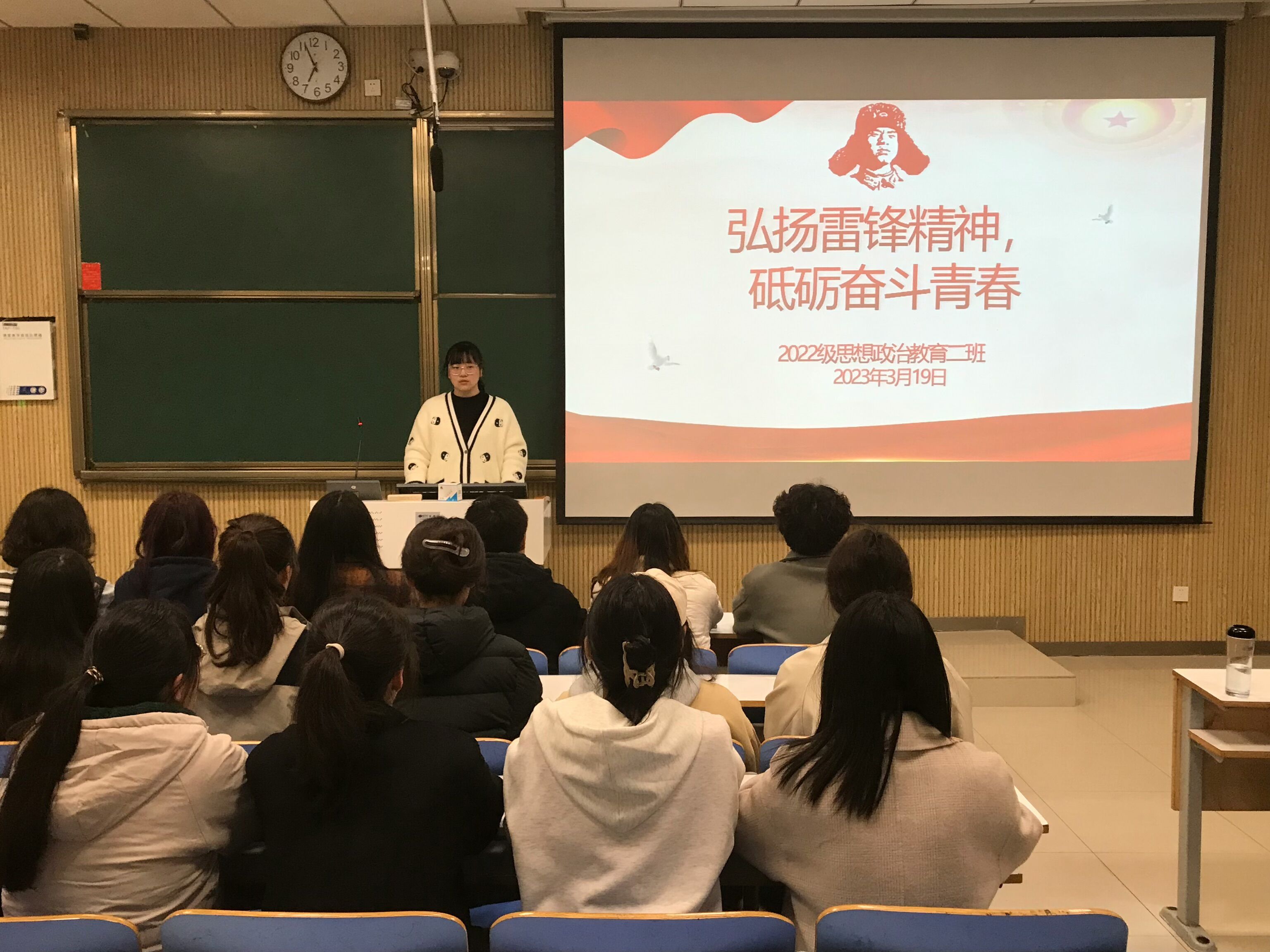 3月19日下午,sjb世俱杯网站2022级思想政治教育二班在社科楼515教室召开“弘扬雷锋精神,砥砺奋斗青春”主题团课,2022级思想政治教育二班全体同学共同参加。团课由团支书李佳音主持。