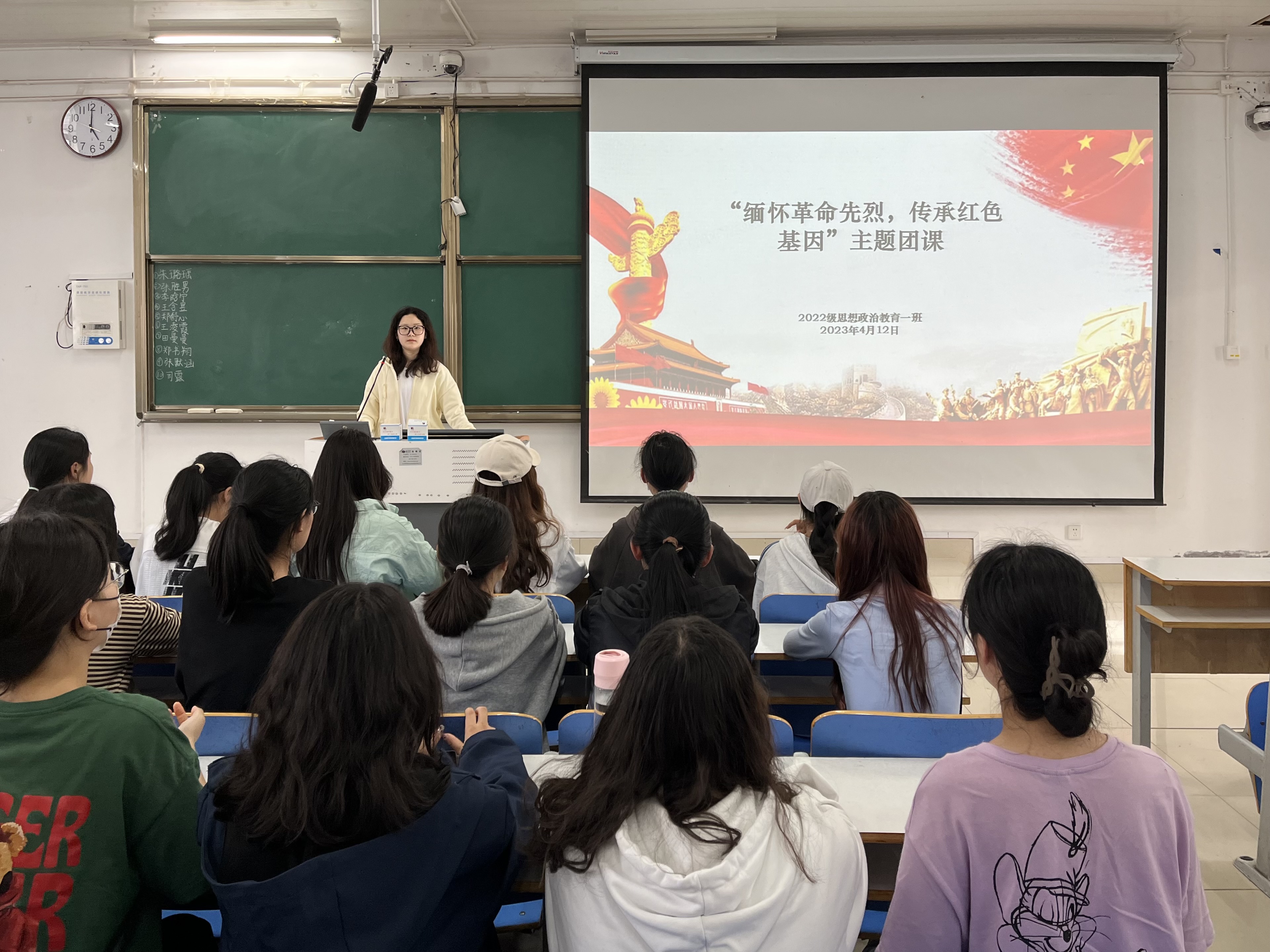 为弘扬爱国主义精神,缅怀革命先烈,4月12日下午,sjb世俱杯网站2022级思想政治教育一班在社科楼514教室召开“缅怀革命先烈,传承红色基因”主题团课。2022级思想政治教育一班全体同学共同参与本次团课,团课由团支书李佳茹主持。