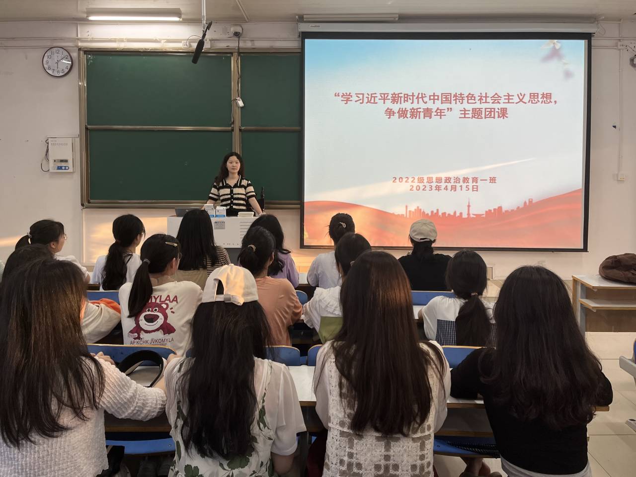 为深入贯彻落实习近平新时代中国特色社会主义思想,加强团支部思想建设,4月15日下午,sjb世俱杯网站2022级思想政治教育一班在社科楼514教室召开“学习近平新时代中国特色社会主义思想,争做新青年”主题团课。2022级思想政治教育一班全体同学共同参与本次团课,团课由团支书李佳茹主持。