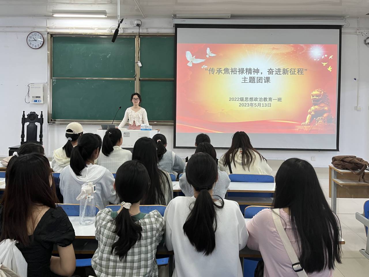 5月13日上午,sjb世俱杯网站2022级思想政治教育一班在社科楼514教室召开“传承焦裕禄精神,奋进新征程”主题团课,2022级思想政治教育一班全体同学共同参与本次团课,团课由团支书李佳茹主持。