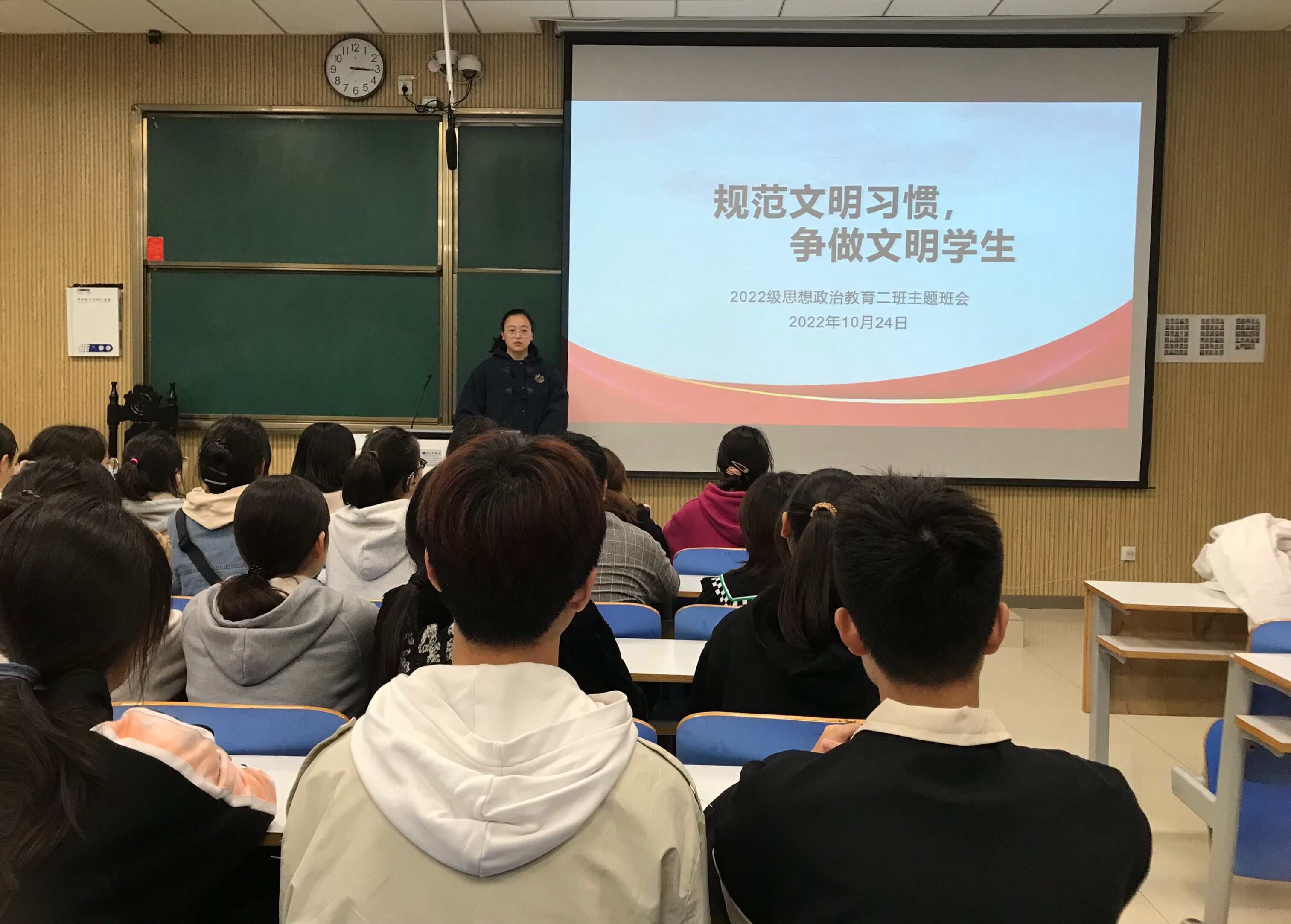 为引导大学生进一步培育和践行社会主义核心价值观、推进文明校园建设,10月24日下午,sjb世俱杯网站2022级思想政治教育二班在社科楼514教室召开“规范文明习惯,争做文明学生”主题班会。2022级思想政治教育二班全体同学共同参加会议。本次会议由团支书李佳音主持。