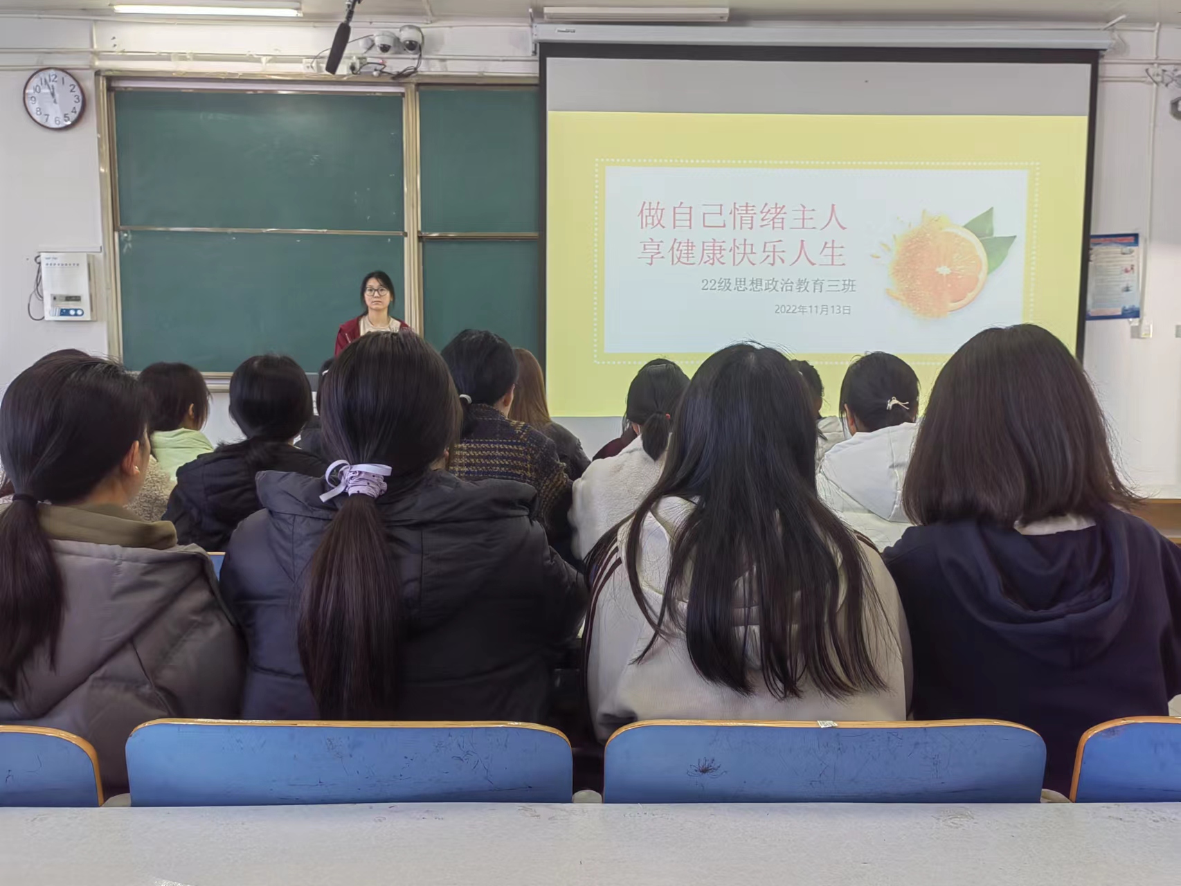 为进一步提高大学生心理素质,促进身心健康,11月13日上午,sjb世俱杯网站2022级思想政治教育三班在社科楼514教室召开“做自己情绪主人,享健康快乐人生”主题班会。世俱杯官网2022级思想政治教育三班全体成员共同参加班会,班会由心理委员张韶涵主持。