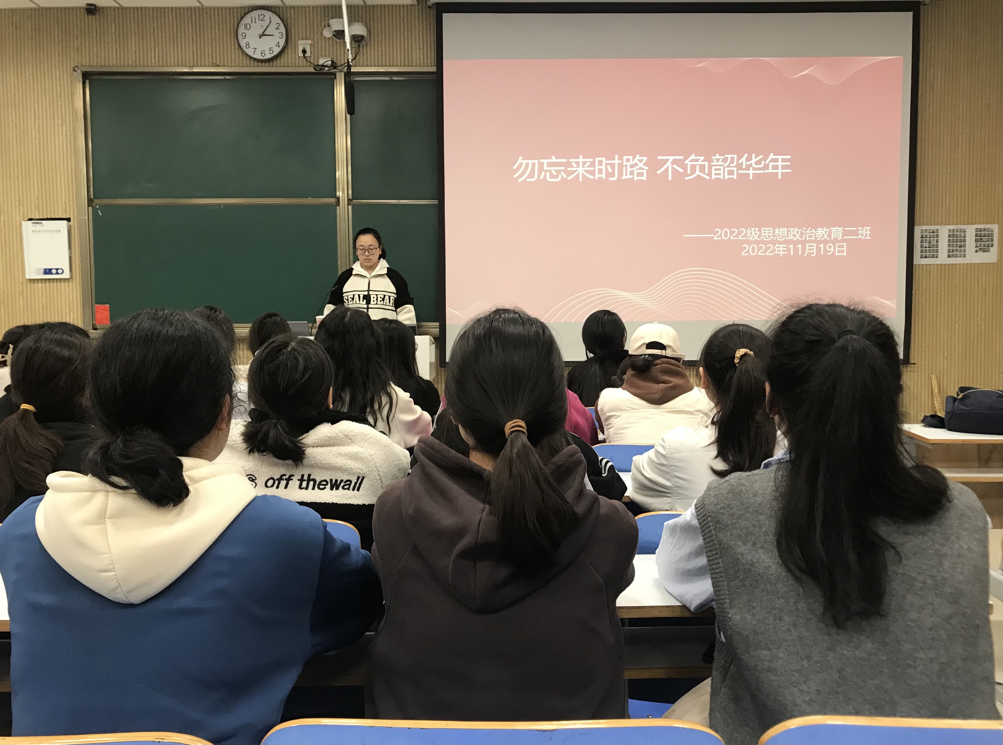 为进一步激发大学生的爱国情怀、凝聚奋进力量,11月19日下午,sjb世俱杯网站2022级思想政治教育二班在社科楼515教室召开“勿忘来时路 不负韶华年”主题班会。2022级思想政治教育二班全体同学共同参加会议。本次会议由团支书李佳音主持。