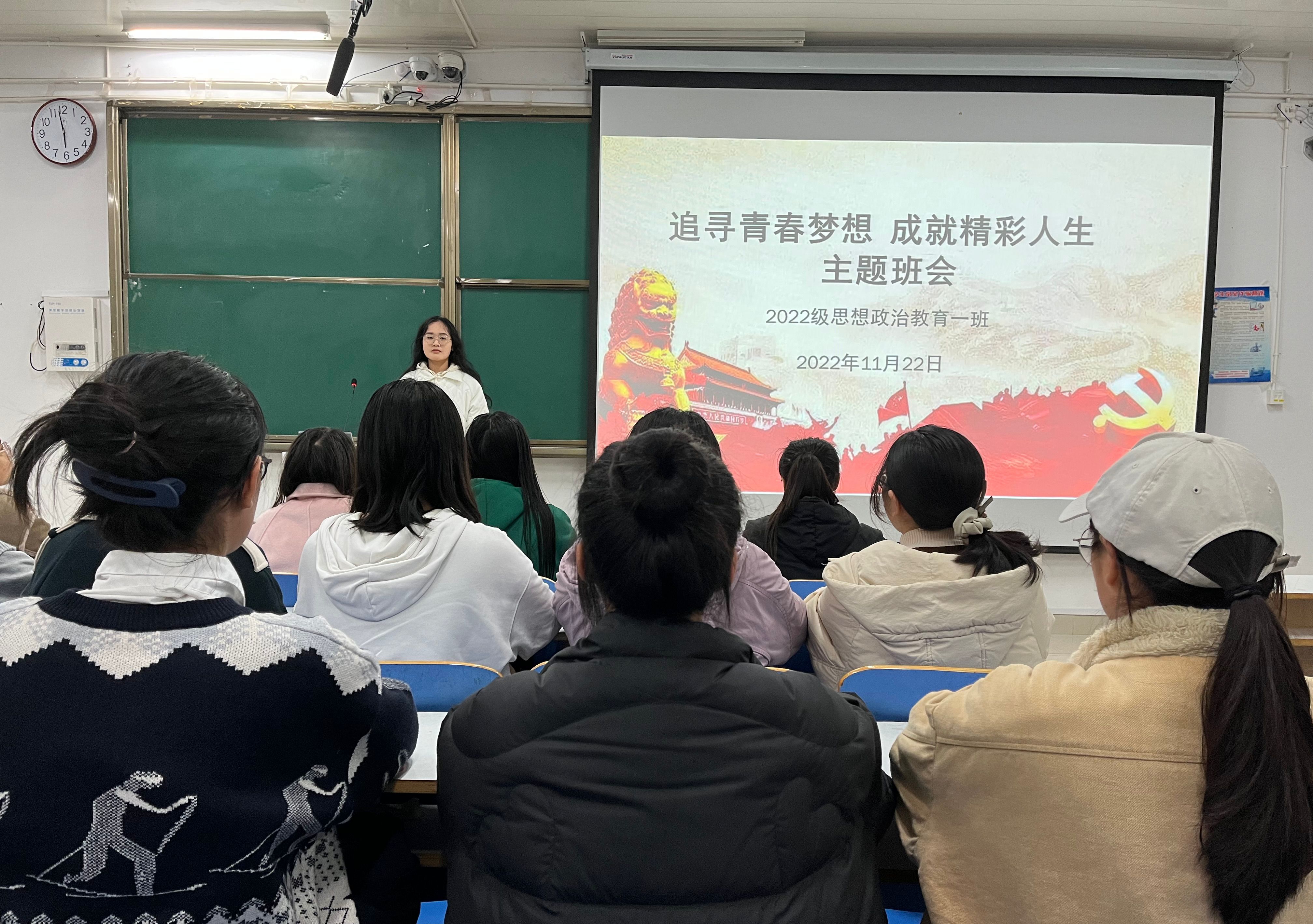 为帮助同学们确立人生目标,实现远大理想,11月22日下午,sjb世俱杯网站2022级思想政治教育一班在社科楼514教室召开“追寻青春梦想,成就精彩人生”主题班会。2022级思想政治教育一班全体同学参与本次班会,班会由学习委员司露主持。