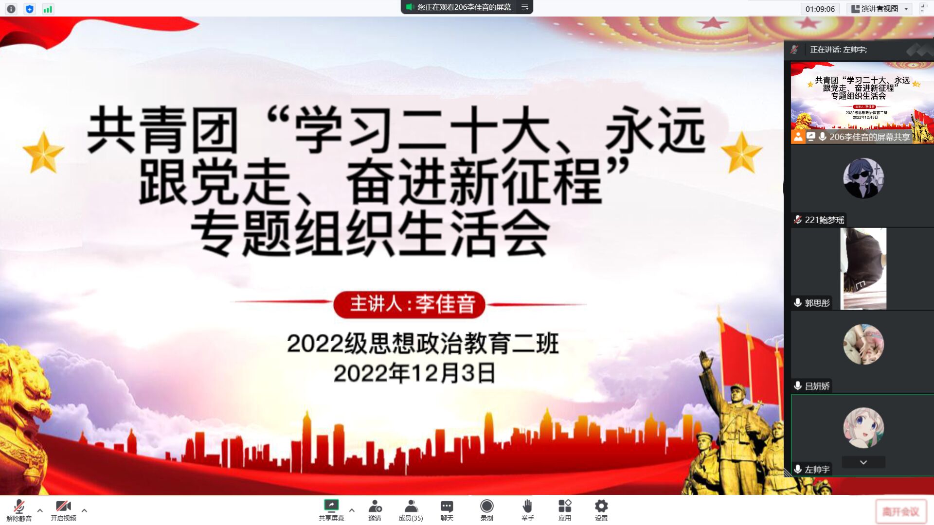 为深入学习贯彻党的二十大精神,加强基层团组织建设,12月3日晚上,sjb世俱杯网站2022级思想政治教育二班于线上召开共青团“学习二十大、永远跟党走、奋进新征程”专题组织生活会。2022级思想政治教育二班全体共青团员共同参加会议。本次会议由团支书李佳音主持。