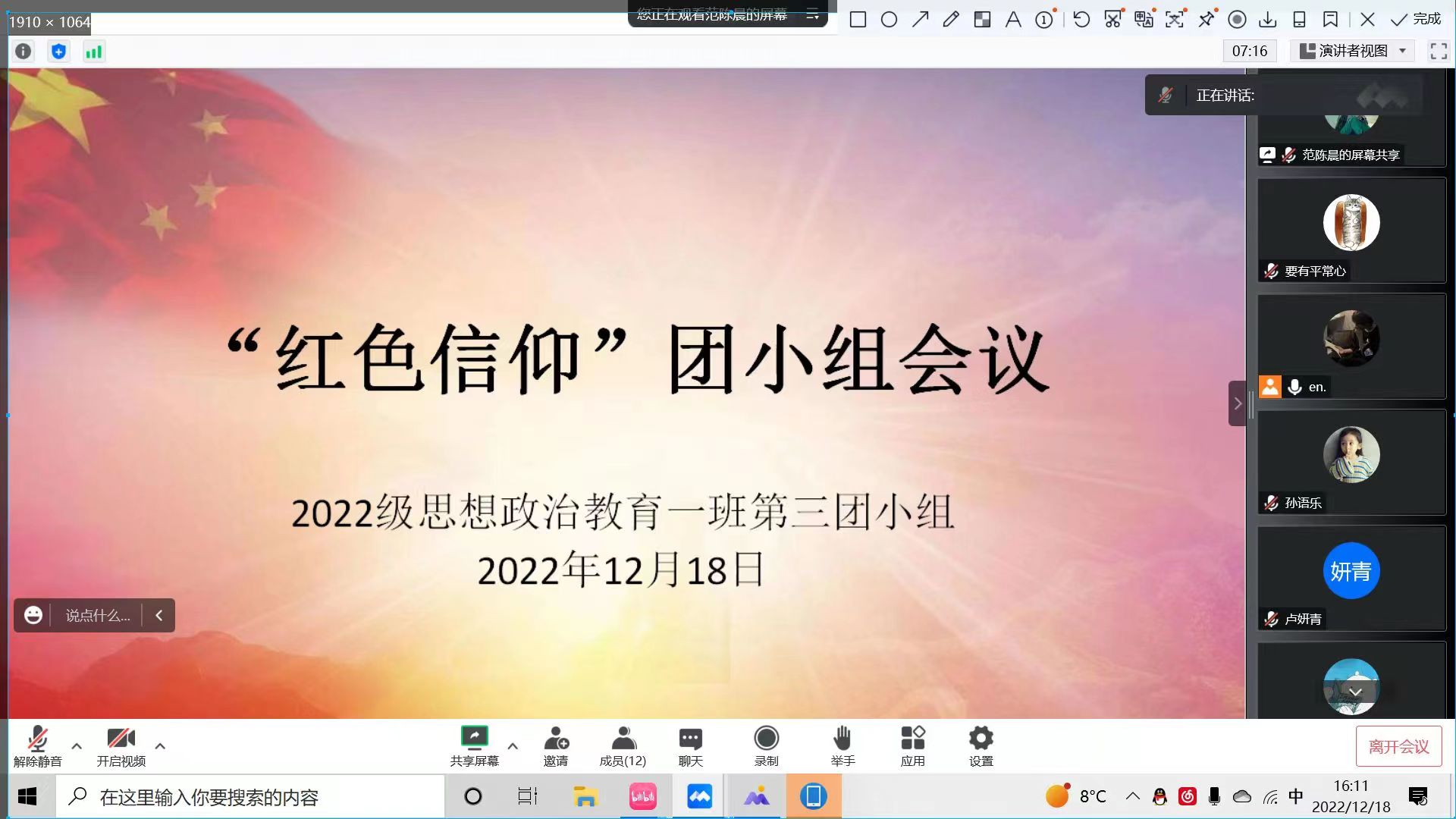 为加强团员党的理论学习,坚定红色信仰,12月18日下午,sjb世俱杯网站2022级思想政治教育一班团员在线上召开“红色信仰”团小组会议。2022级思想政治教育一班团员参与本次会议,会议由团支部副书记闻炎仲主持。