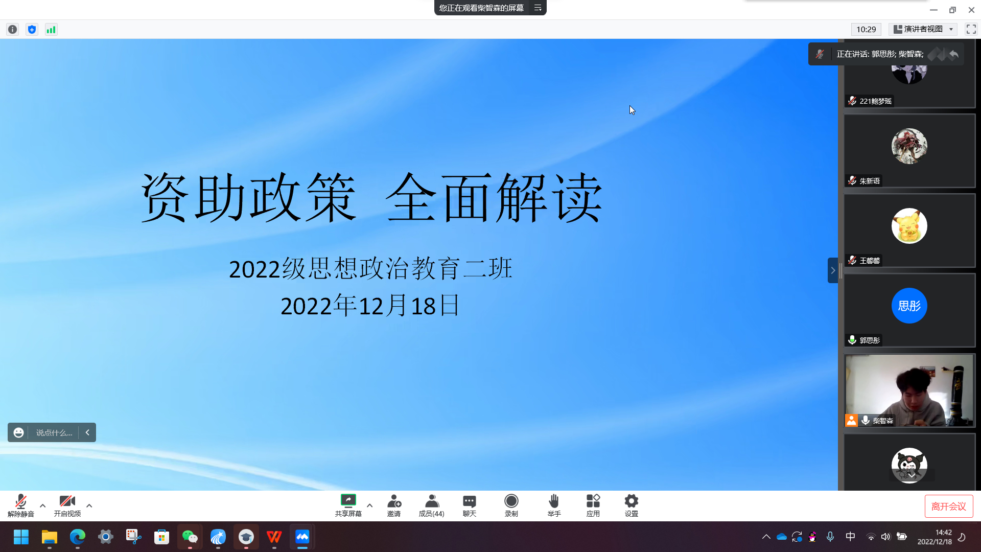 为使学生进一步了解和明确国家教育资助政策,提升资助育人质量,12月18日下午,sjb世俱杯网站2022级思想政治教育二班于线上召开“资助政策 全面解读”主题班会。2022级思想政治教育二班全体同学共同参加会议。班会由副班长柴智森主持。