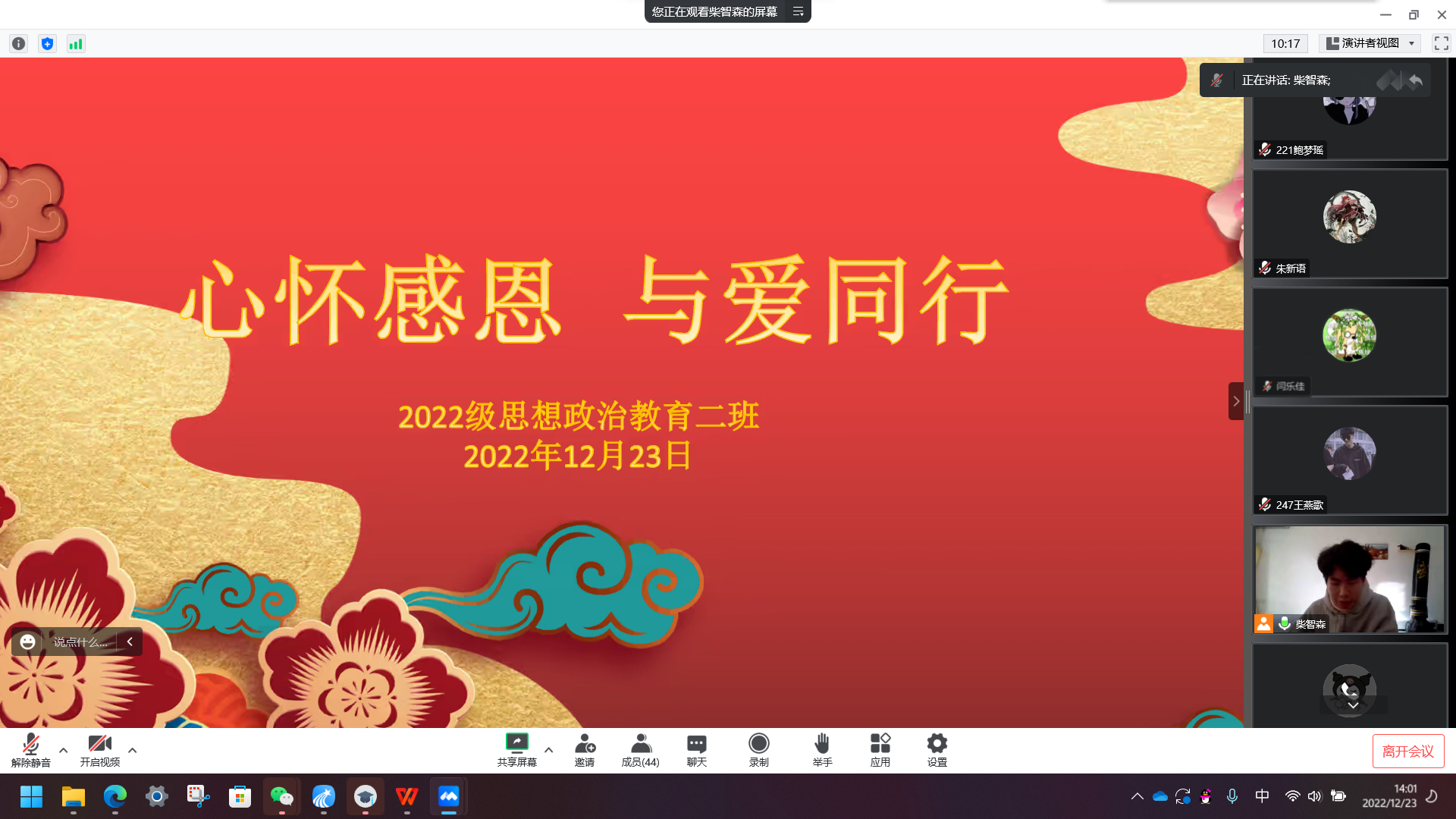 为更好贯彻“五育并举,德育为先”的教育理念,弘扬中华民族传统美德,12月23日下午,sjb世俱杯网站2022级思想政治教育二班于线上召开“心怀感恩 与爱同行”主题班会。2022级思想政治教育二班全体同学共同参加会议。班会由副班长柴智森主持。