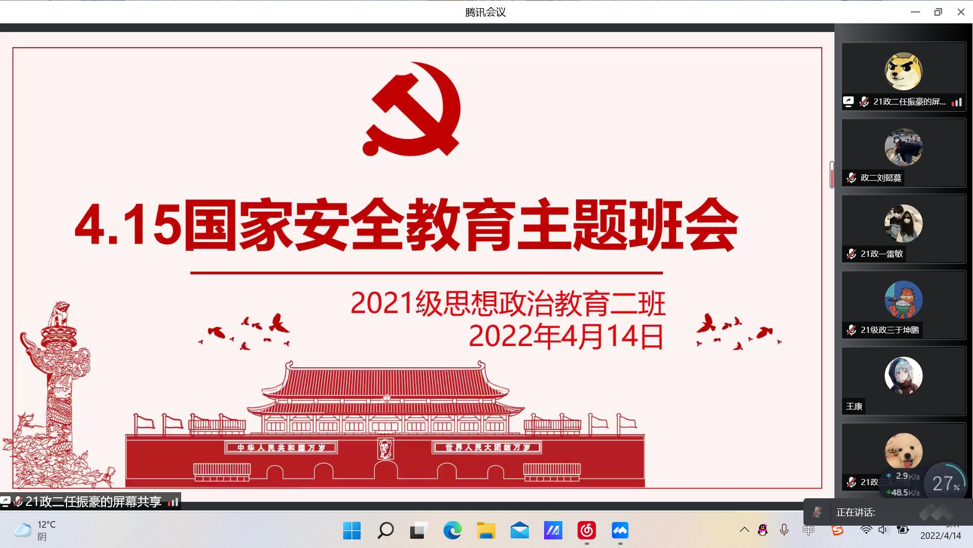 4月14日,sjb世俱杯网站2021级思想政治教育二班在腾讯会议召开“4.15国家安全教育”主题班会。2021级思想政治教育二班全体成员参与此次主题班会,班会由团支书王婧欣主持。