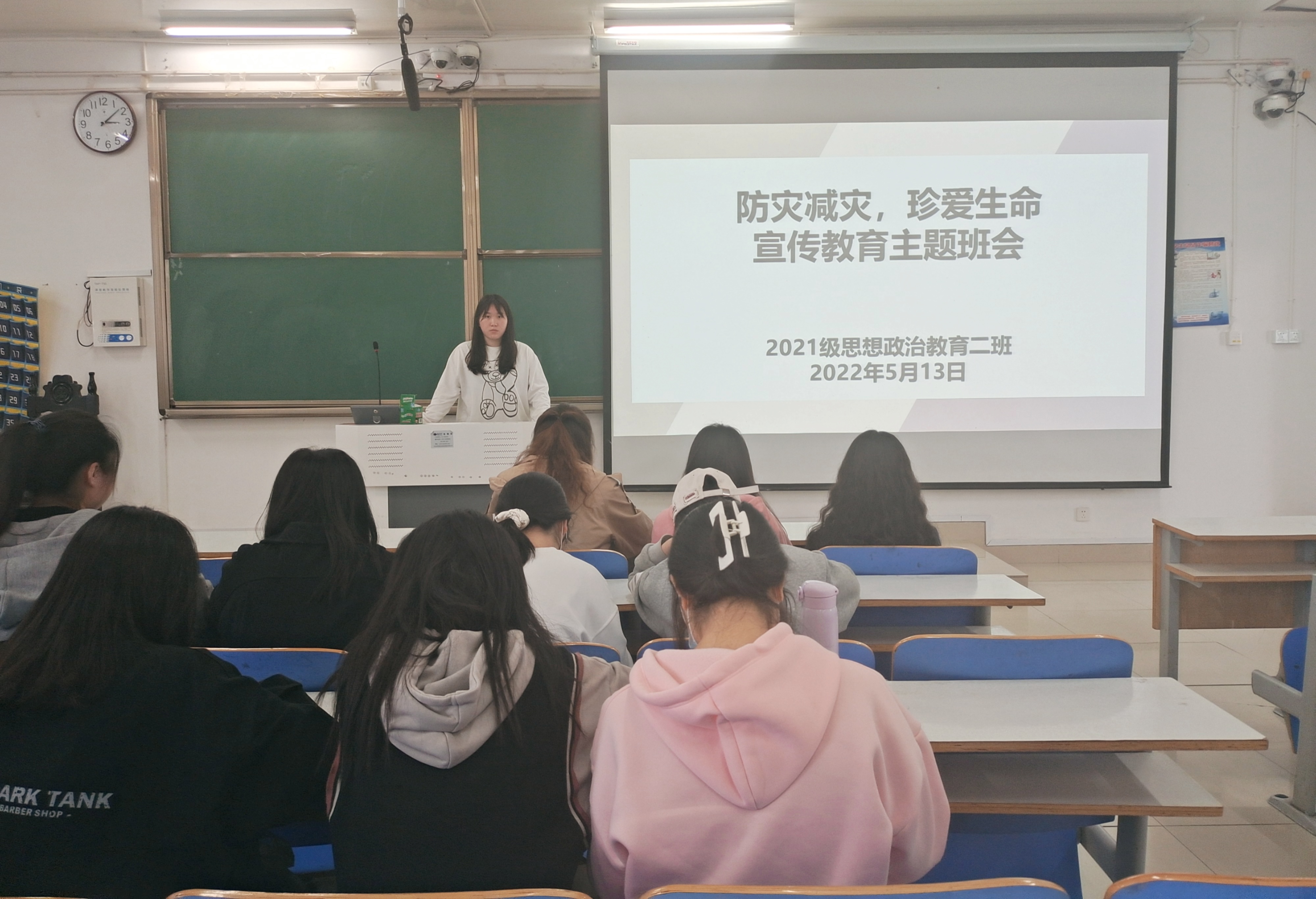 5月13日,sjb世俱杯网站2021级思想政治教育二班在社科楼514教室召开“防震减灾,珍爱生命”宣传教育主题班会。2021级思想政治教育二班全体成员参加此次主题班会。班会由团支书王婧欣主持。