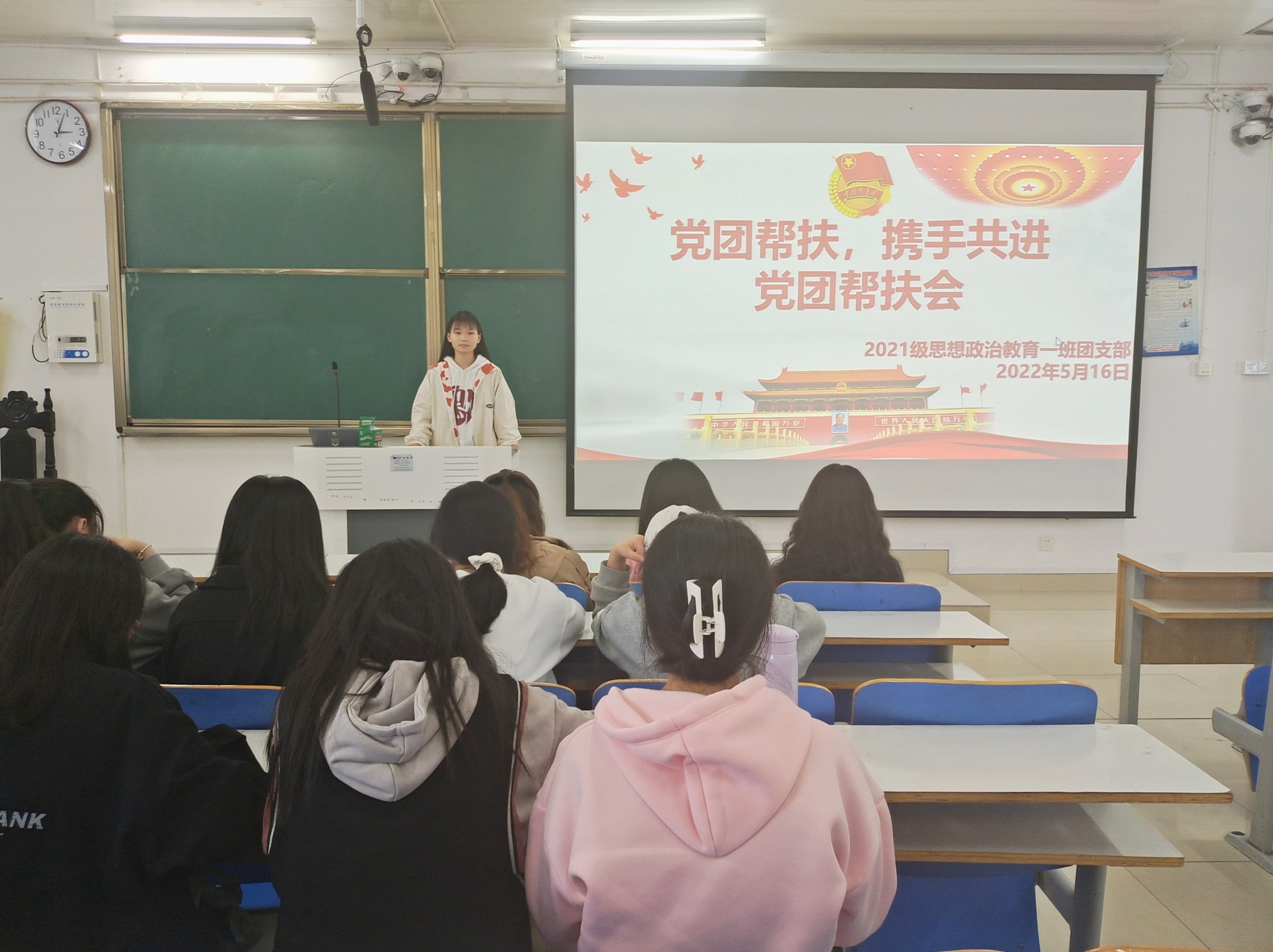 5月16日下午,sjb世俱杯网站2021级思想政治教育一班在社科楼514教室召开“党团帮扶,携手共进”党团帮扶会。2019级思想政治教育一班正式党员刘鹏、宋雨潇以及2021级思想政治教育一班全体团员共同参加了本次会议。会议由团支书戴翰林主持。