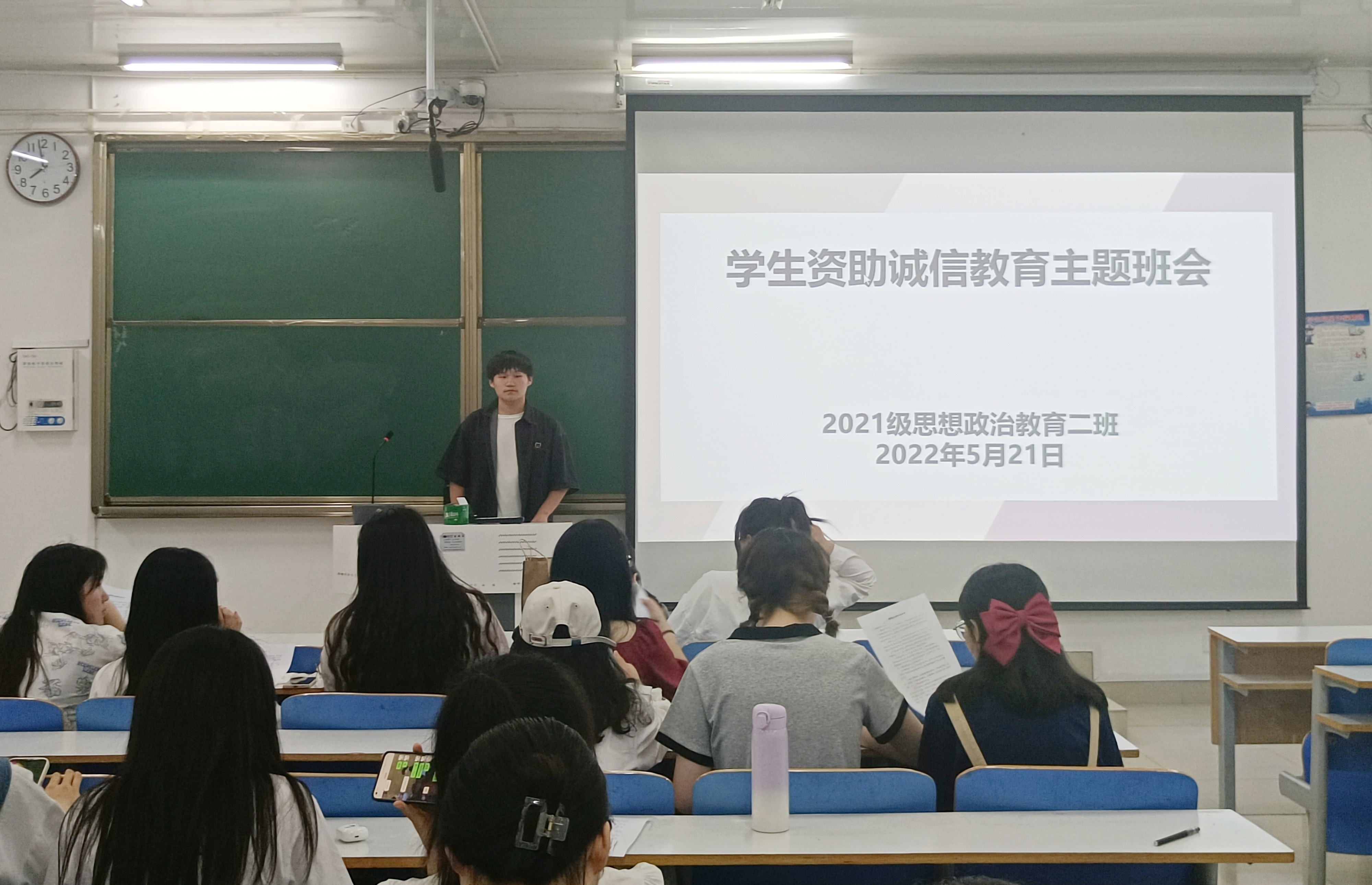 5月21日下午,sjb世俱杯网站2021级思想政治教育二班在社科楼514教室召开“学生资助诚信教育”主题班会。2021级思想政治教育二班全体同学参加此次班会。班会由副班长任振豪主持。