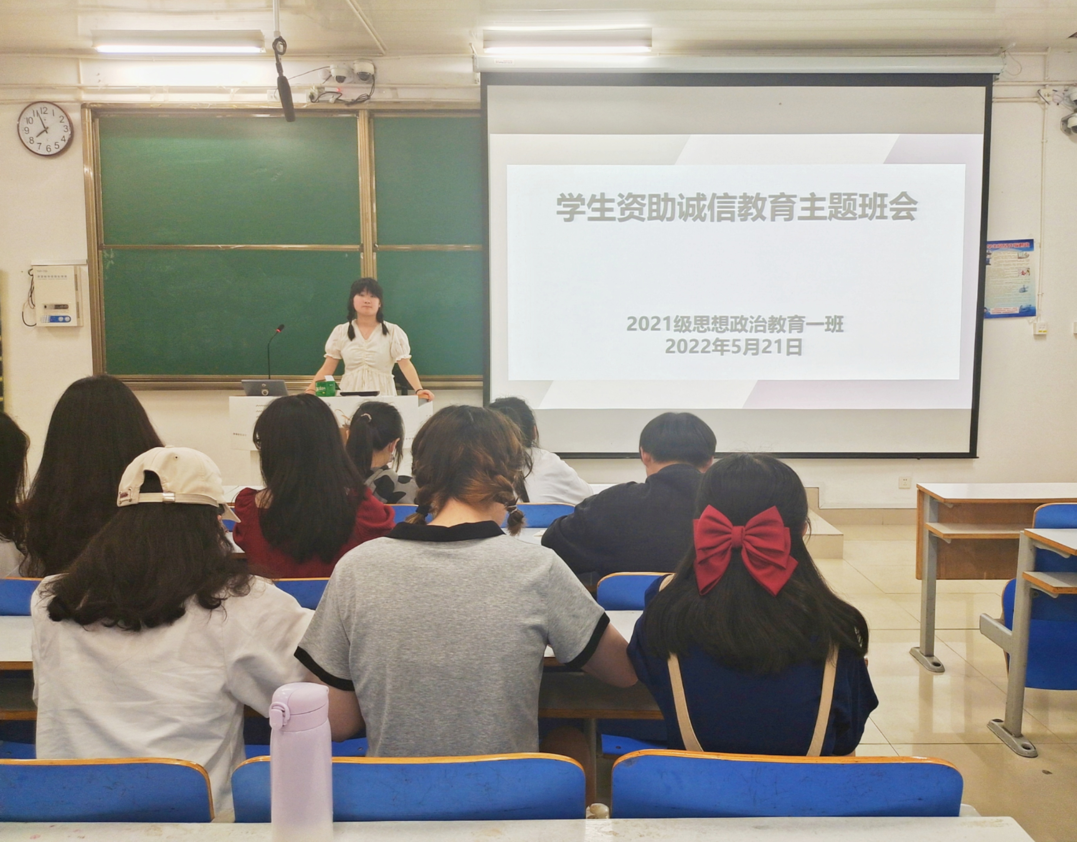 5月21日晚上,sjb世俱杯网站2021级思想政治教育一班再社科楼516教室召开“学生资助诚信教育”主题班会。2021级思想政治教育一班全体成员共同参加了本次班会,班会由副班长雷敏主持。