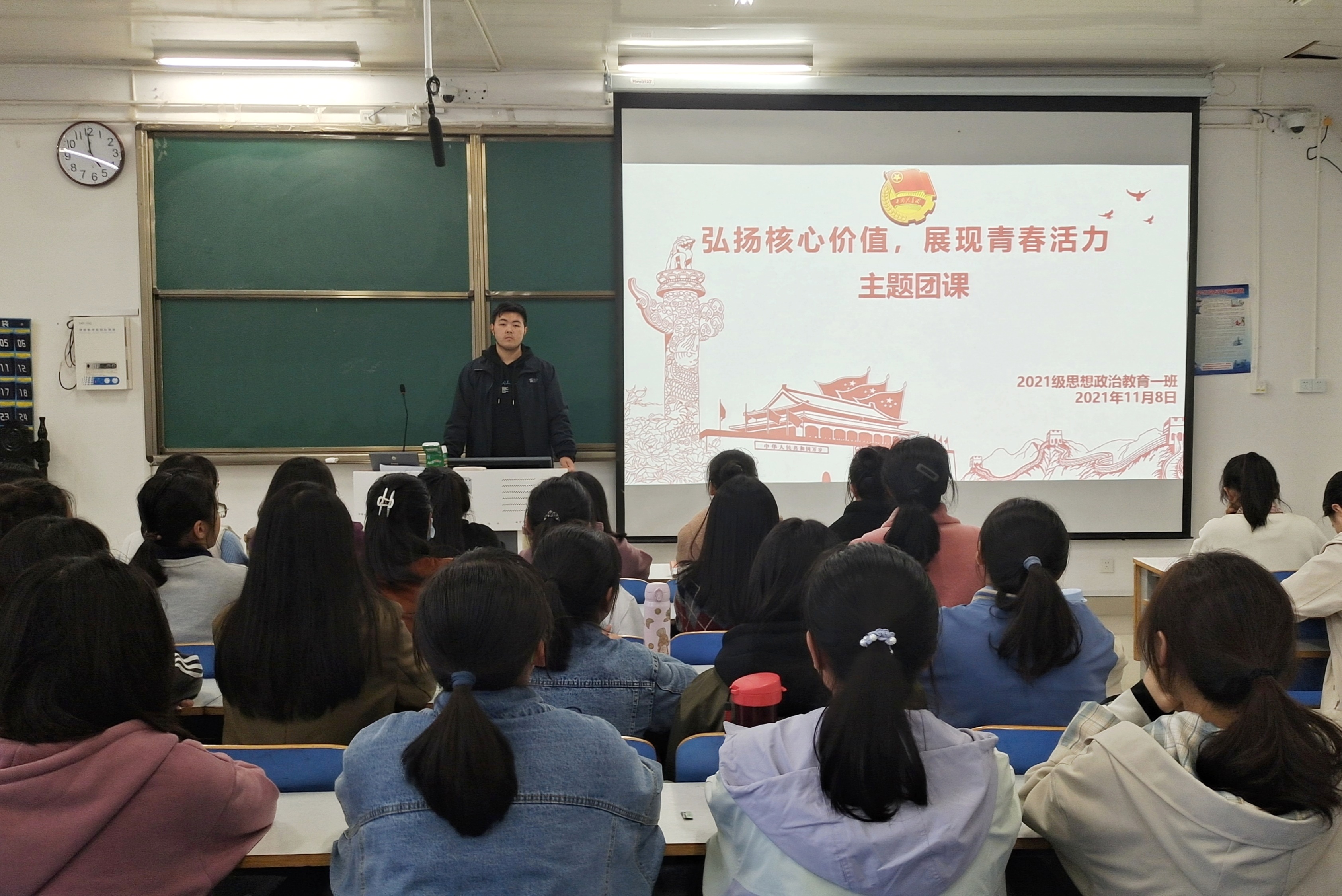 为深入学习贯彻习近平新时代中国特色社会主义思想,引导全体团员牢固树立四个意识,坚定四个自信,11月8日下午,sjb世俱杯网站2021级思想政治教育一班在社科楼516教室召开“弘扬核心价值观,展现青春活力”主题团课。2021级思想政治教育一班全体团员参加本次团课。团课由团支书戴翰林主持。