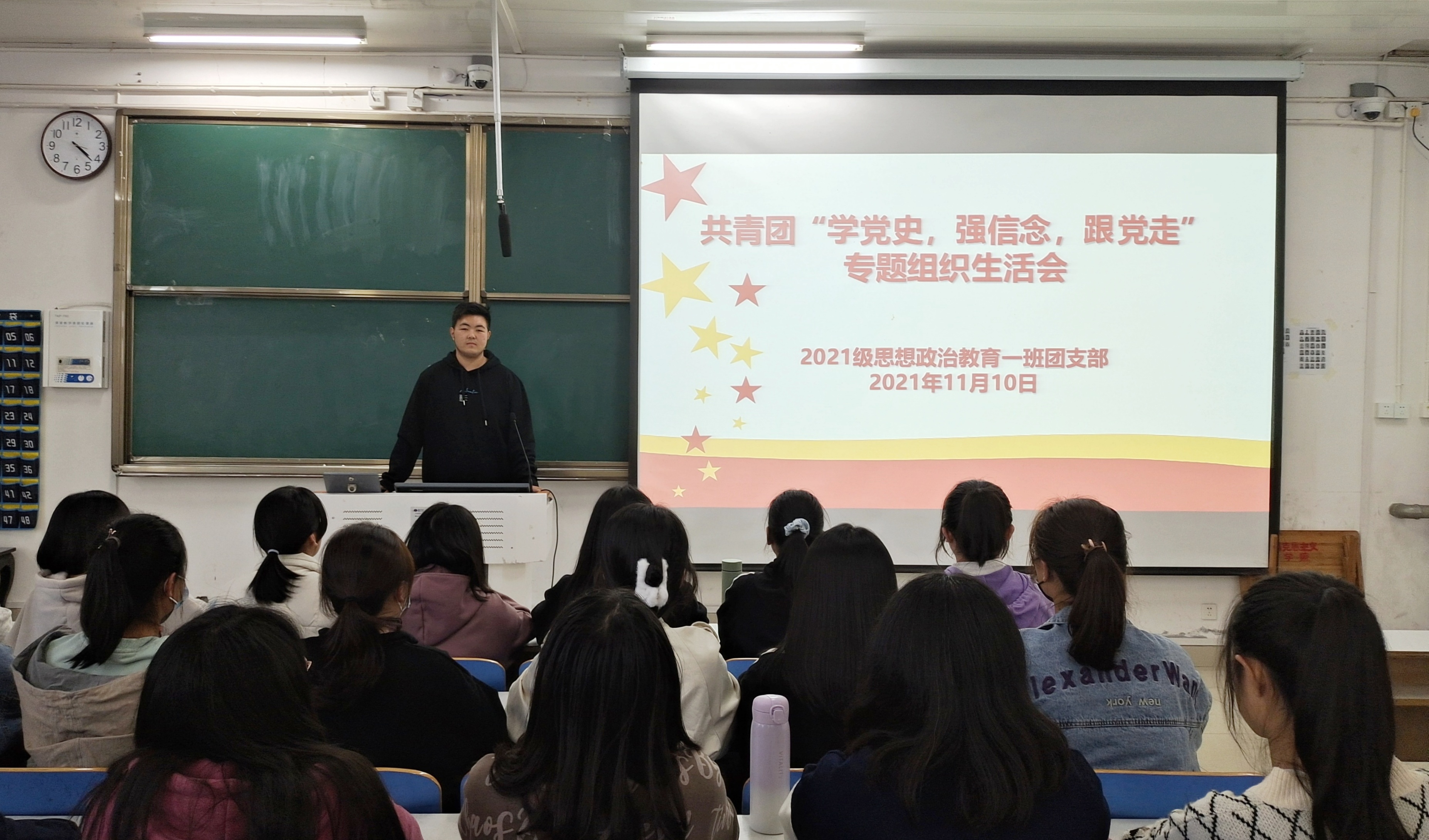 响应共青团“学党史、强信念、跟党走”的号召,11月10日下午,sjb世俱杯网站2021级思想政治教育一班在社科楼516教室召开组织生活会。2021级思想政治教育一班全体成员参加了本次大会。会议由团支书戴翰林主持。
