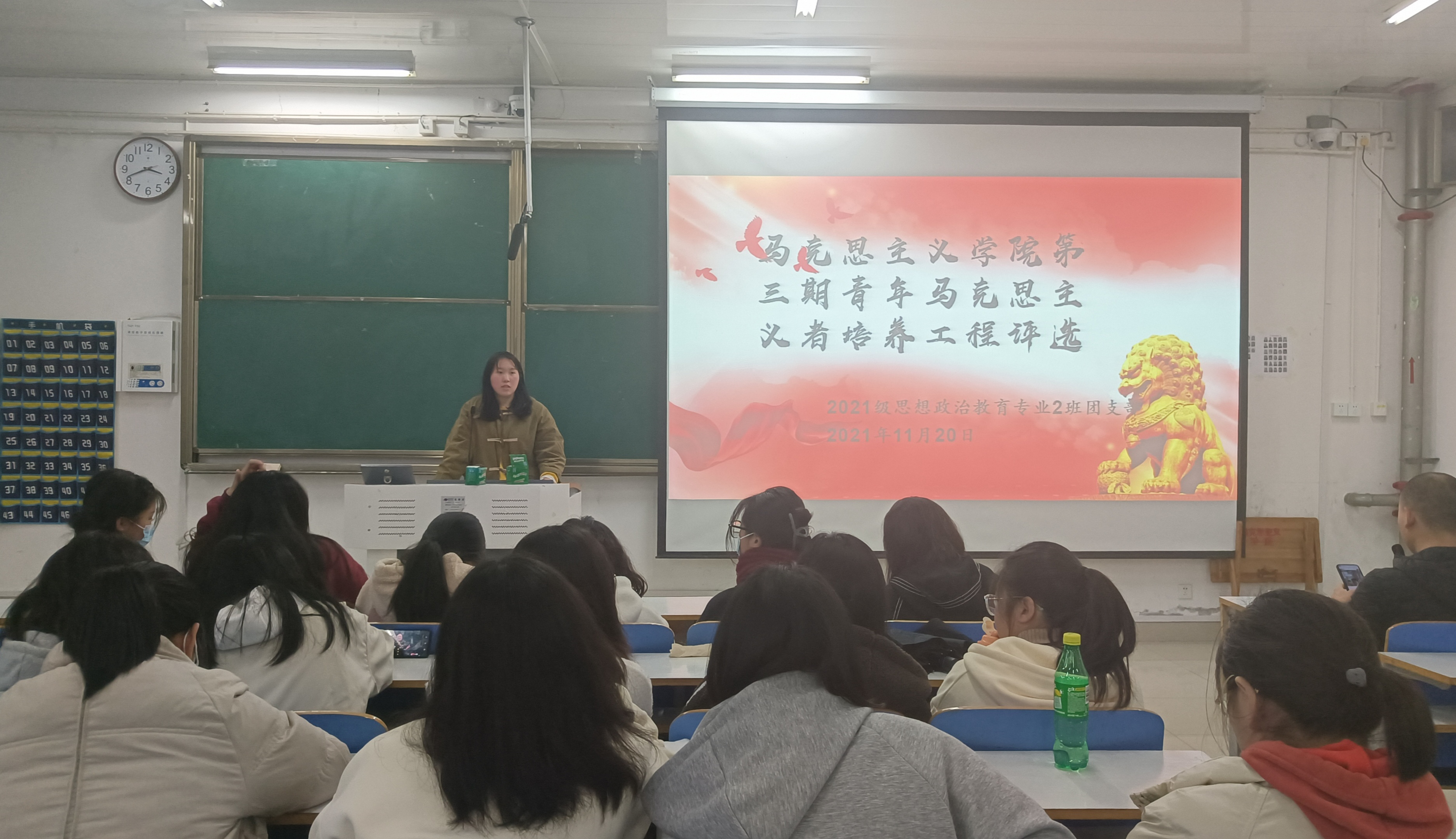 11月20日下午,sjb世俱杯网站2021级思想政治教育二班第三期青年马克思主义者培养工程评选会在社科楼516教室召开。辅导员周文豪及2021级思想政治教育二班全体团员参与此次评选会。班会由团支书王婧欣主持。