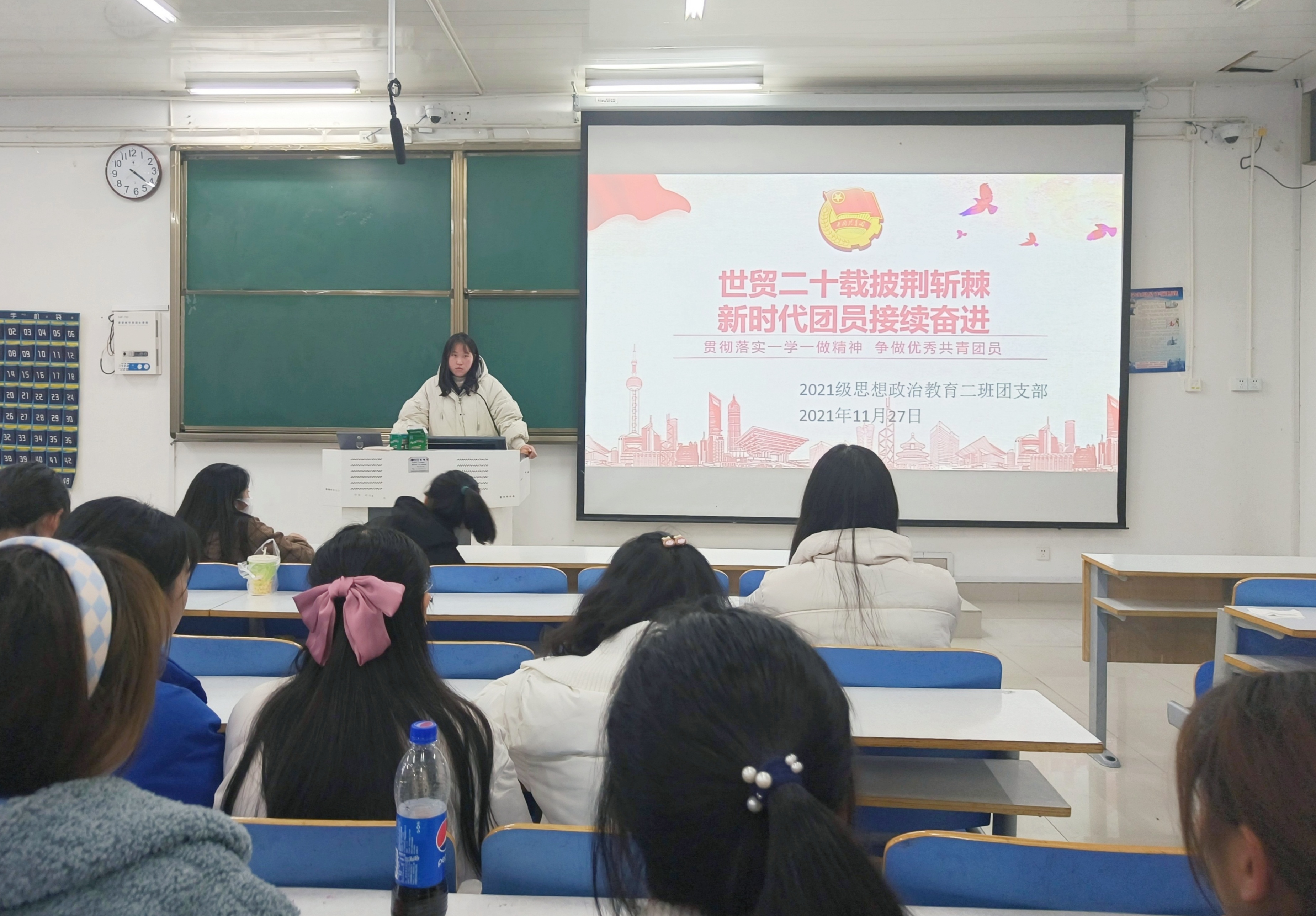 11月27日晚上,sjb世俱杯网站2021级思想政治教育二班在社科楼514教室召开“世贸二十载披荆斩棘,新时代团员接续奋进”主题团课。2021级思想政治教育二班全体同学参加此次团课,团课由团支书王婧欣主持。
