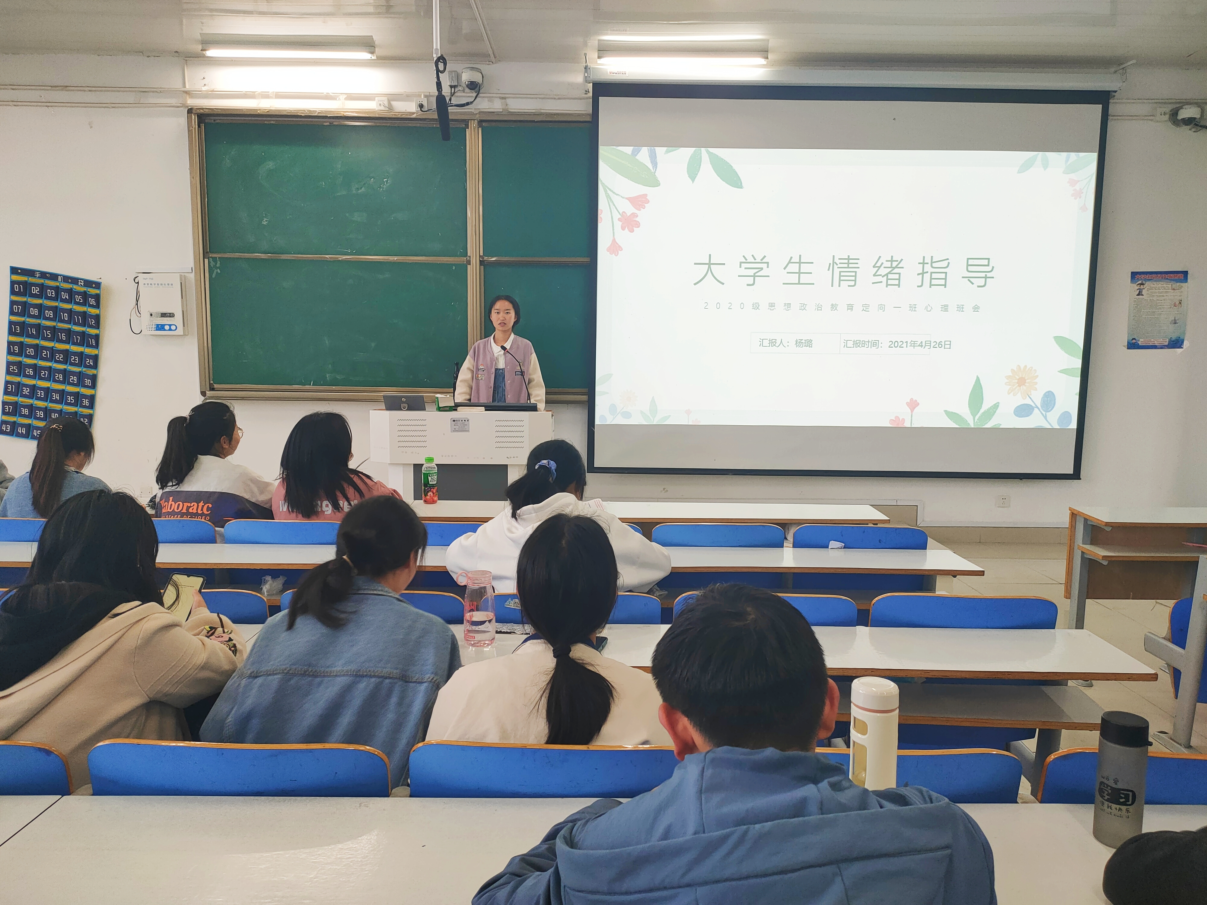 4月26日下午,sjb世俱杯网站思想政治教育(定向)一班在社科楼514教室顺利举办“大学生情绪指导”心理班会。sjb世俱杯网站思想政治教育(定向)一班全体学生聆听了此次班会,班会由生活委员杨璐主持。