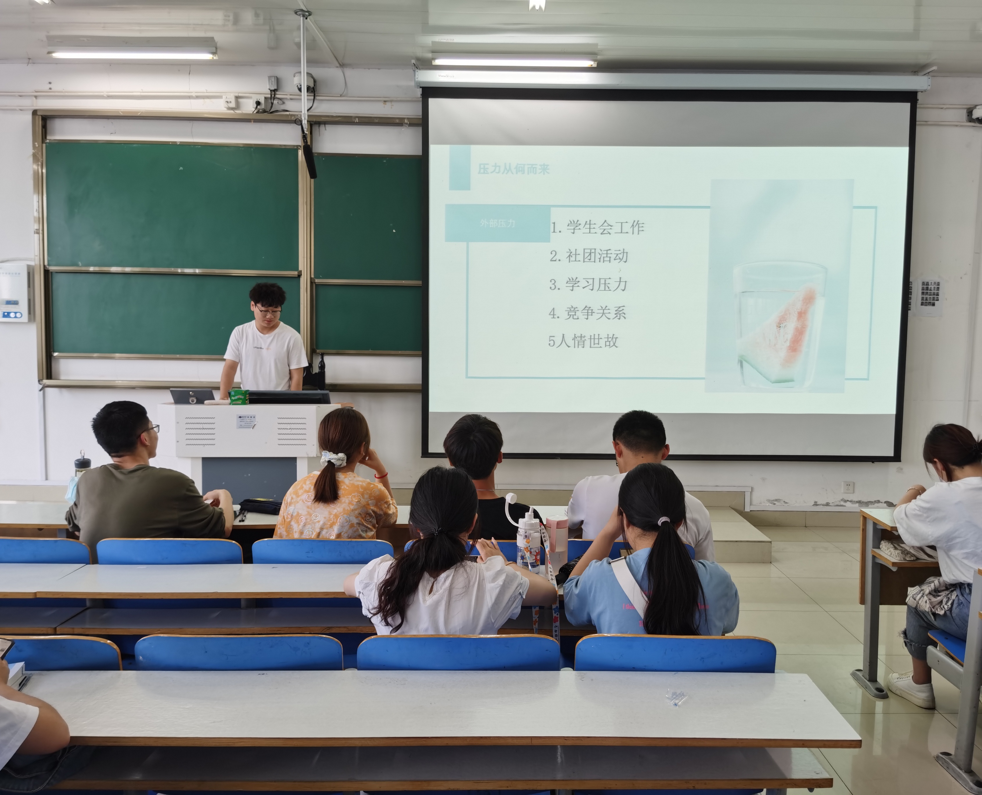 王旭从“压力从何而来”“如何正确看待压力”“合理管理压力”“走上幸福生活”四个部分对班会内容进行介绍。首先,王旭同学对管理压力做了简要论述,部分同学对管理压力发表的自己的看法。随后,王旭播放了一些小视频,向全班同学展示了压力过大导致精神奔溃的事例,对合理管理压力做出了讲解与论述。接着,他通过提问和互相交流的方式让同学们明白合理管理压力的重要性和必要性,和大家共同探讨如何正确管理压力。最后,大家共同交流分享自己缓解压力的办法,本次班会圆满结束。