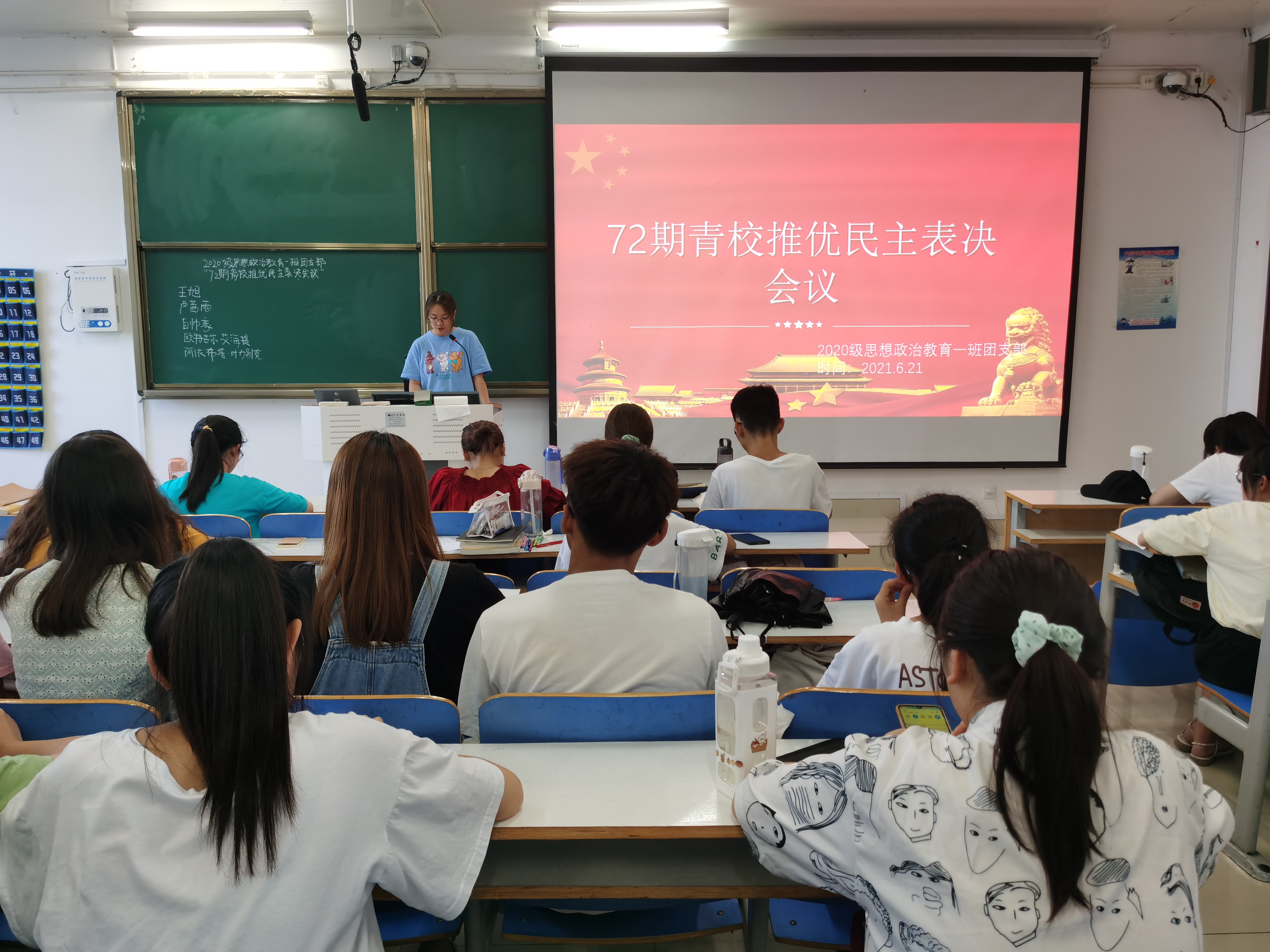 6月21日下午,sjb世俱杯网站2020级思想政治教育一班在社科楼514教室召开72期青校推优表决会议,2020级思想政治教育一班全体团员参加本次表决会议,大会由团支书卢茜雨主持。