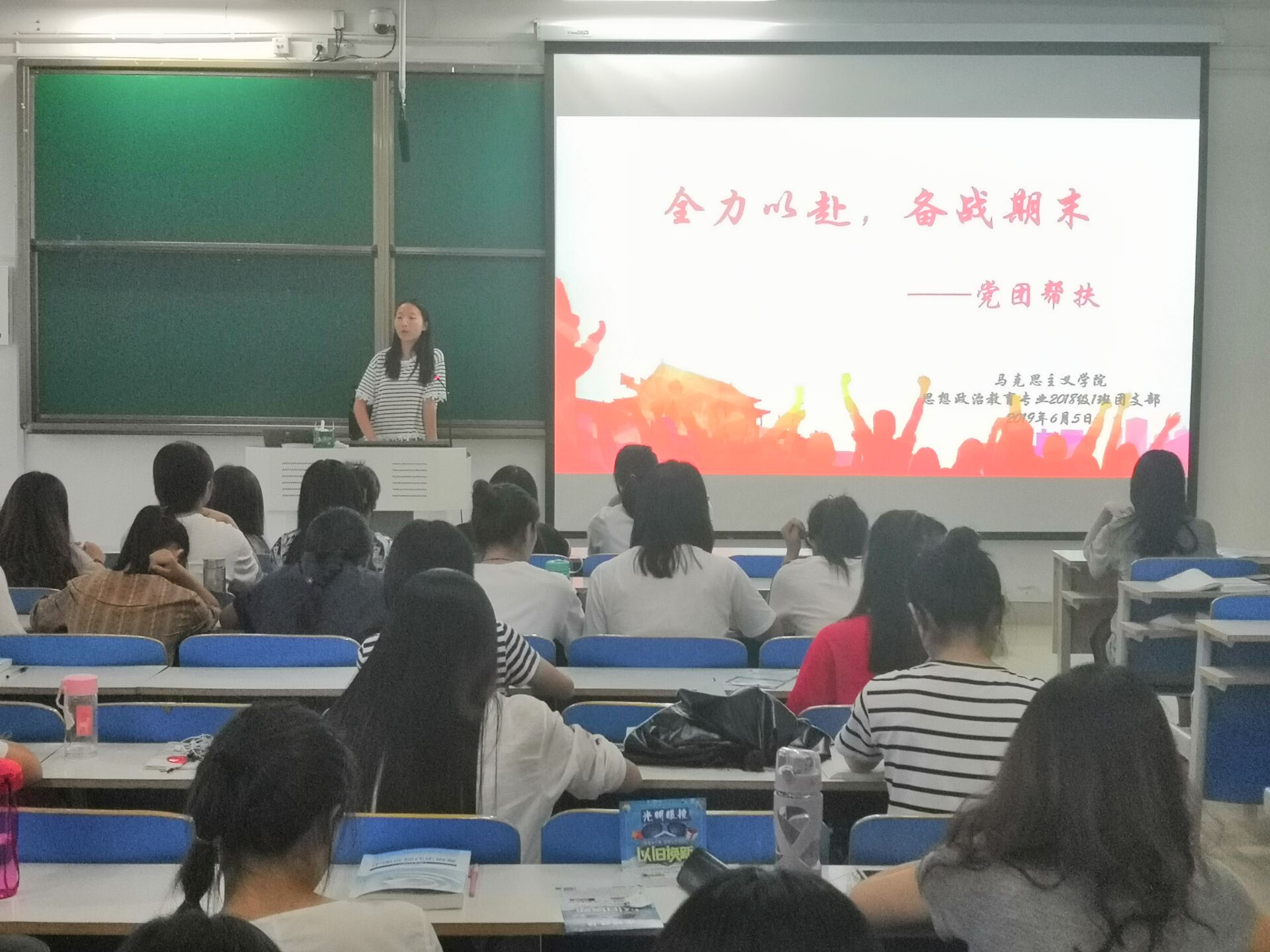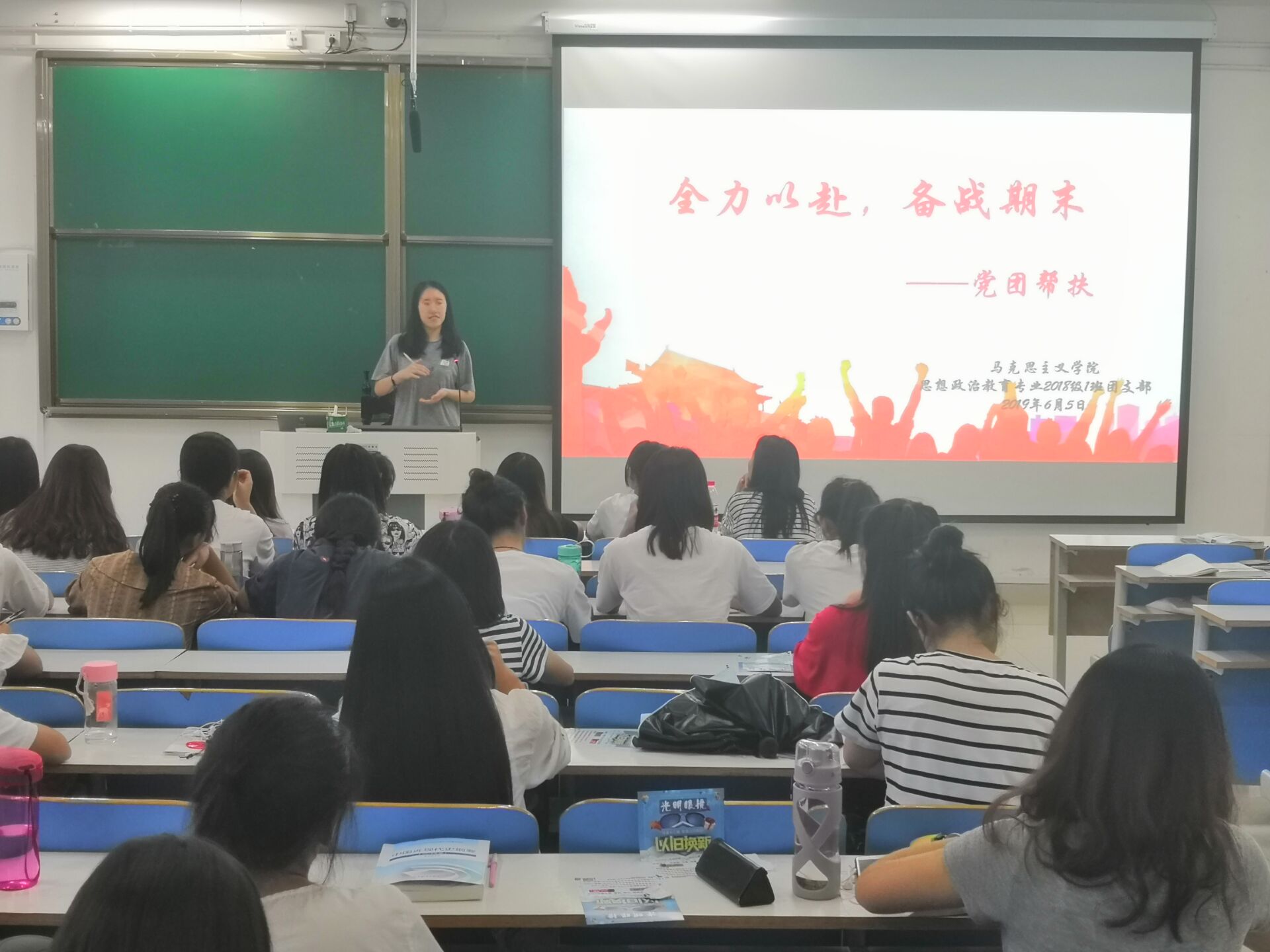 为充分发挥党员干部的先锋模范作用,帮助同学们解决学习和生活问题,6月5日下午,sjb世俱杯网站2018级思想政治教育一班在社科楼516教室顺利开展“党团帮扶”班会。2018级思政一班全体同学共同参加此次会议。会议由团支书靳雨露主持。