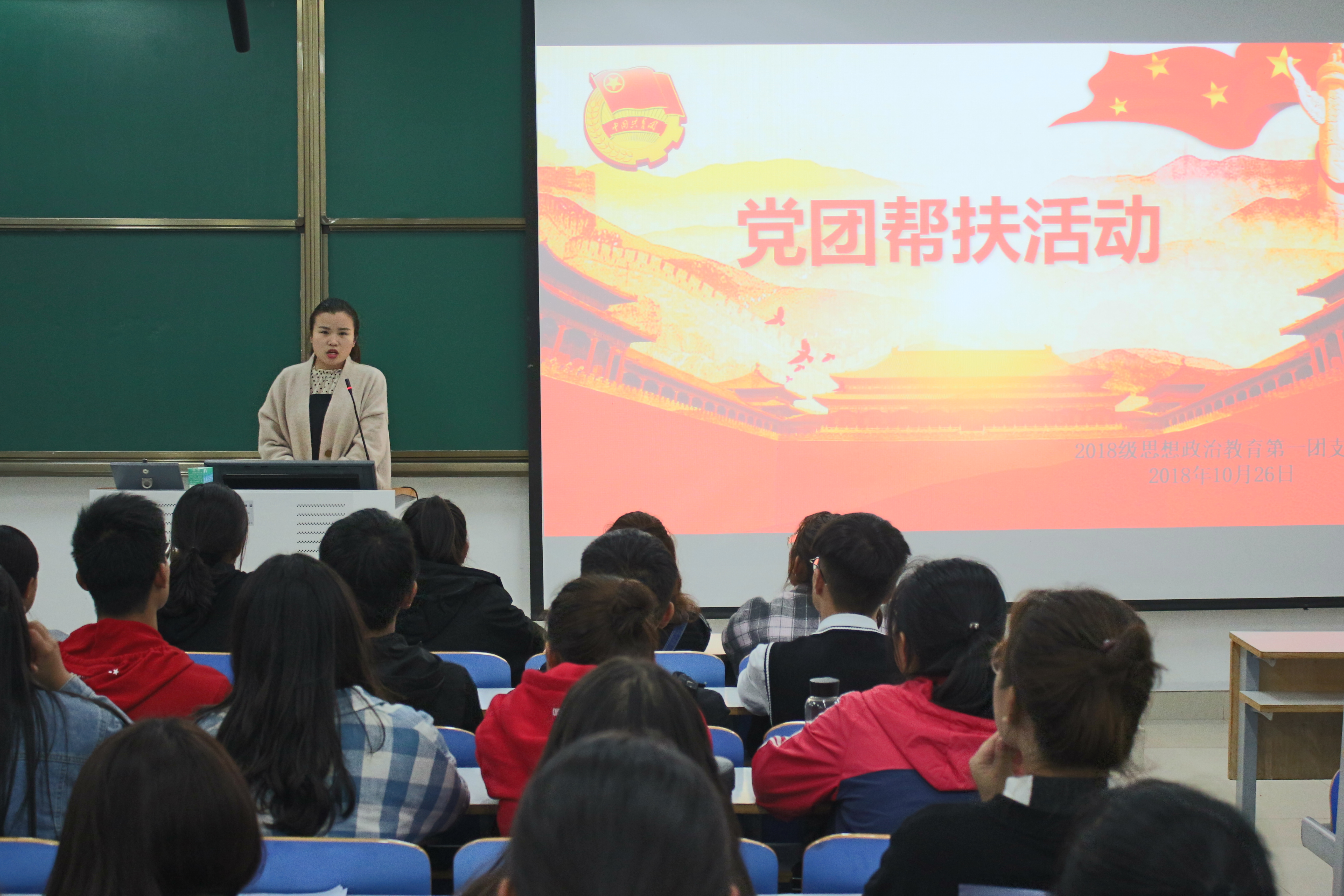 为充分发挥党员干部的先锋模范作用,促进学生全面健康发展。10月26日晚,sjb世俱杯网站2018级思想政治教育一班在社科楼514教室顺利开展“党团帮扶”班会。2018级思政一班全体同学参加此次班会。班会由团支书靳雨露主持。