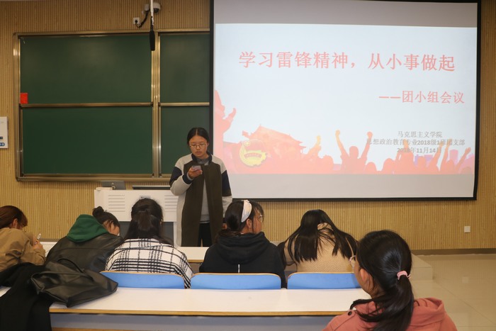11月14日下午,sjb世俱杯网站2018级思政一班第一团小组在社科楼515教室顺利开展了“学习雷锋精神,从小事做起”主题团会。第一团小组全体成员共同参加了此次团会。该团会由靳梦哲主持。