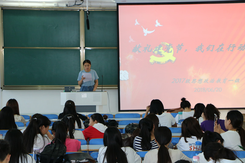 为在学生中间更好地宣传党史、学习党史、了解党史、激发学生热爱中国共产党的热情,同时培养学生的爱党之情,感恩党的情怀,6月20日下午2017级思想政治教育一班全体同学在社科楼514教室举行了“敬礼建党节,我们在行动”的主题班会。本次班会由组织委员吴亦昕主持。