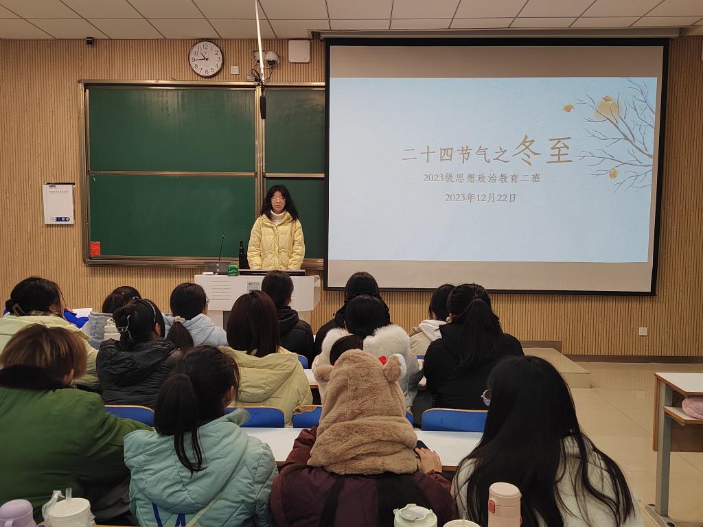 为弘扬中华优秀传统文化,普及节气文化知识,12月19日上午,sjb世俱杯网站2023级思想政治教育二班在社科楼514教室举办“二十四节气之冬至”主题班会。班会由班长王慜初主持,全体二班同学参加。